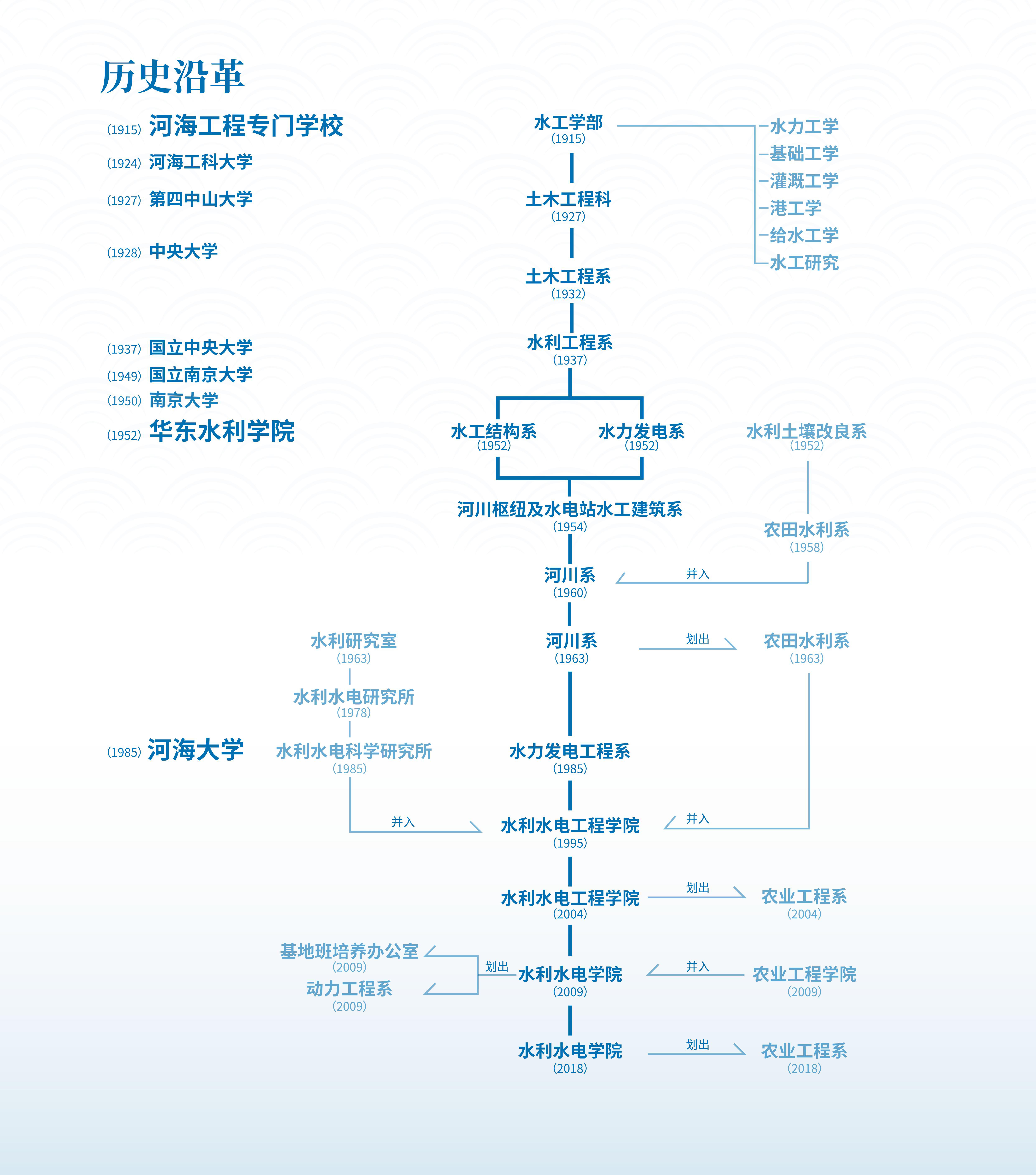 1915年,在“大工将施,储才为急”的时代背景下,河海工程专门学校创办时,便设立了水工学部核心教学单位,成为我国水利工程建设领域最早开展高等教育的组织。1952年,华东水利学院建立时,赓续传统创设了水力发电系和水工结构系,矢志为迫切的新中国水利事业培养专门建设人才。1954年,水力发电系和水工结构系合并为河川枢纽及水电站水工建筑系,1984年河川系改名为水力发电工程系。建系之初,聚集了一批具有真才实学的名师大家和骨干力量,他们亲自动手制订水工专业教学计划与培养方案,编写讲义和教材,形成了完整的水利水电工程专业人才培养体系,着力培养一大批掌握高级工程技术,规划、设计、建造、管理的水利专门人才。七十年来,水电人遍布祖国的江河湖海,哪里有困难,哪里就有水电人的身影;哪里有需要,哪里就有水电人的步伐。