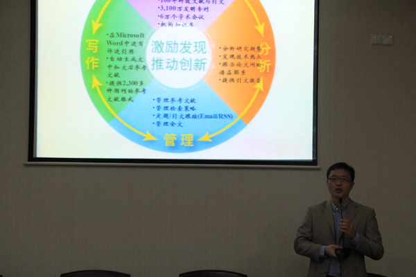 讲座开始由数据库专员介绍科技论文写作的技巧,对NoteExpress软件在论文写作中的应用做了详细分析,随后是各院优秀硕博士生分享自己论文写作的经验。水电院2011级博士生戴凌全用自己的经验就Endnote在文献管理和论文写作中的应用与大家分享;污漫