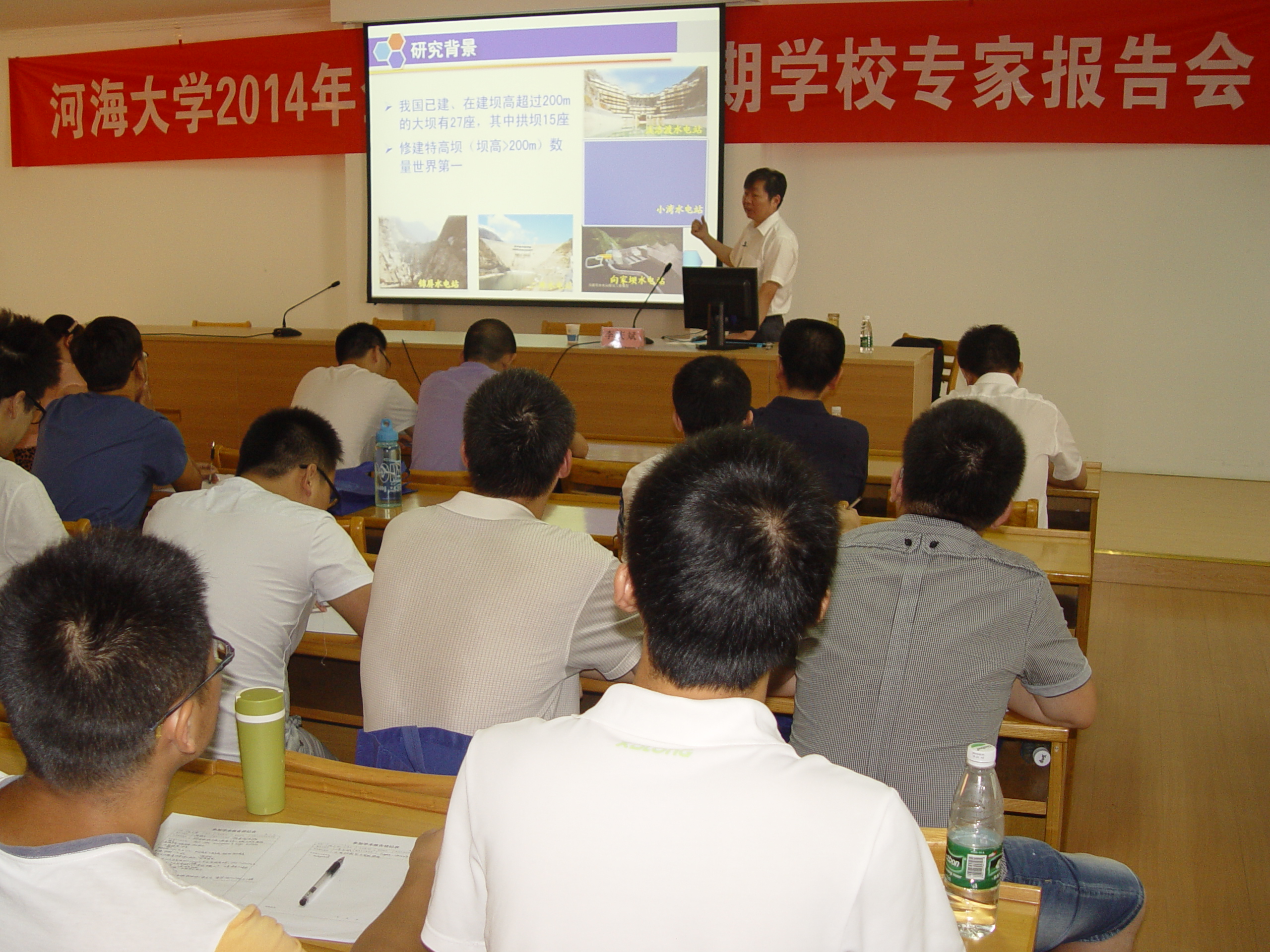 730上午,清华大学水沙科学与水利水电工程国家重点实验室主任李庆斌教授为暑期学校学员们做了题为《大坝混凝土断裂与智能控制》的报告,报告会由污漫 科技处处长任旭华教授主持。