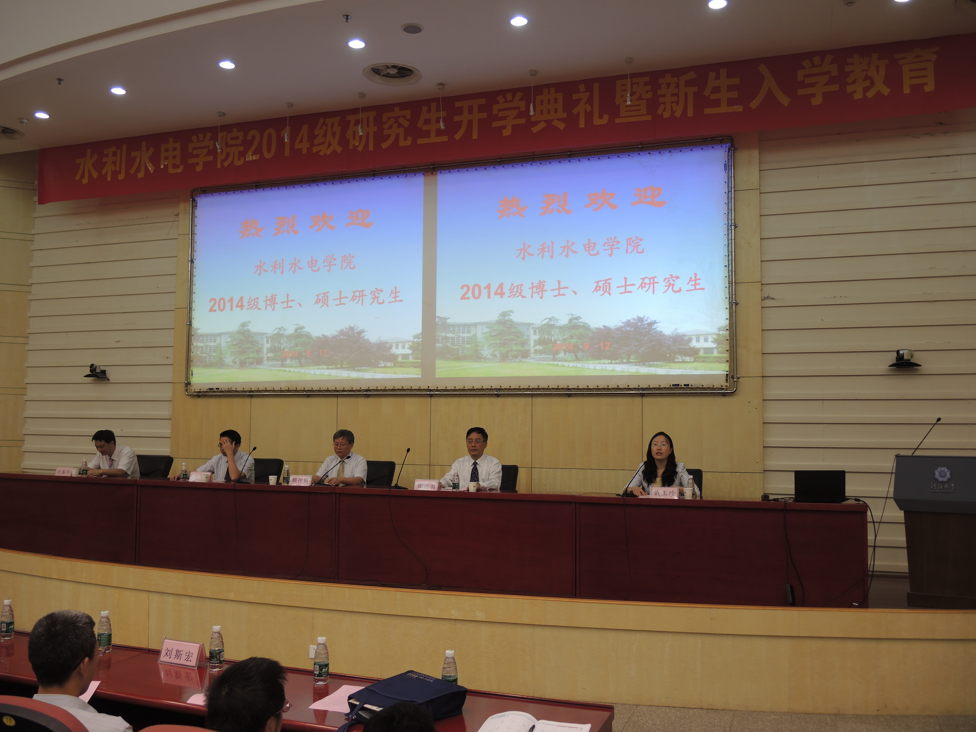 2014年9月12日上午8:30,污漫 在闻天馆108隆重举行2014级博士、硕士研究生开学典礼暨新生入学教育。污漫 院长顾冲时教授,党委书记张展羽教授,副院长肖洋教授、沈振中教授,及水利水电工程系主任蔡付林教授,农业水利工程系主任朱成立副教授,水工结构研究所副所长苏怀智教授,水电研究所副所长周建旭教授,水力学及河流动力学研究所副所长杨校礼老师,农业水土工程研究所所长郭相平教授,农业环境研究所所长邵孝侯教授等出席了典礼,典礼由污漫 党委副书记戴玉珍老师主持。参加典礼的还有污漫 研究生教学秘书周昶老师、研究生辅导员赵志涵老师以及辅导员助管慕子煜老师。