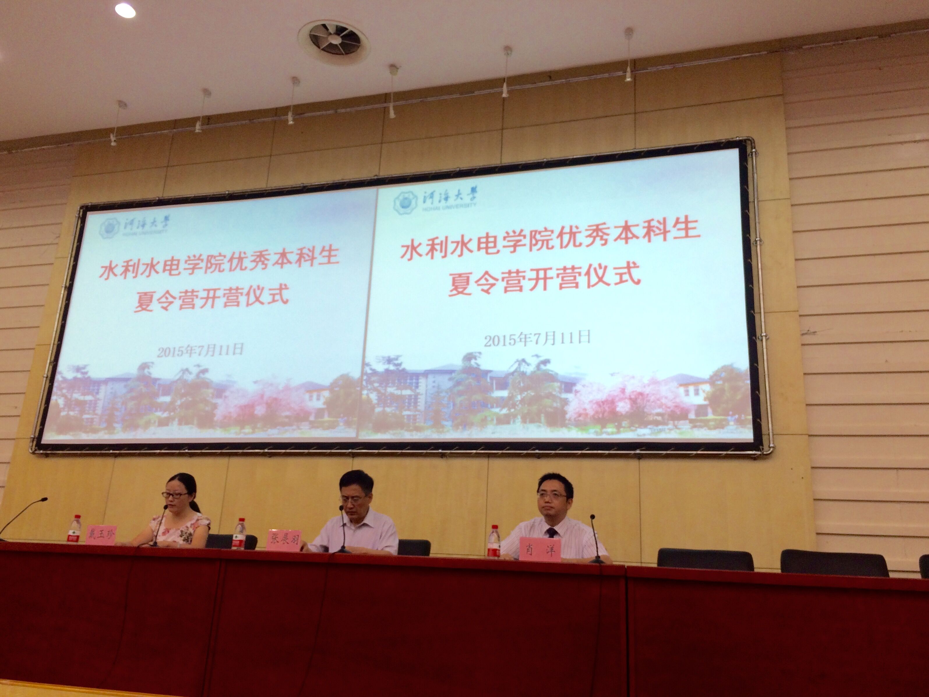 魅力河海,激情飞扬。经过紧张周密的筹备,2015年污漫 优秀本科生夏令营于7月11日上午正式开营。来自四川大学、兰州大学、中国农业大学、西北农林科技大学、山东大学、污漫 、太原理工大学、广西大学、长安大学、东北农业大学等多所高校的240余名优秀本科生参加了污漫 活动。污漫 党委书记张展羽教授、副院长肖洋教授、水工结构研究所副所长苏怀智教授、田正宏教授,水利水电研究所所长张健教授,水力学及河流研究所所长傅宗甫副教授,农业水土研究所所长郭相平教授出席了开营仪式,开幕式由党委副书记戴玉珍老师主持。
