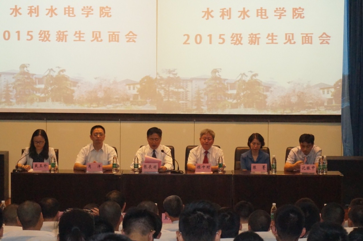 顾冲时院长对2015级254名新生的到来表达了热烈欢迎,同时也向同学们提出了几点希望:践行水利精神,树立远大理想,做一名志向高远、思想睿智、品行高洁、追求卓越的水利人;汲取丰富知识,不断完善自我,提升主动学习、独立思考、大胆质疑的能力;适应新环境,融入学院发展,把水电院当成自己真正的家。