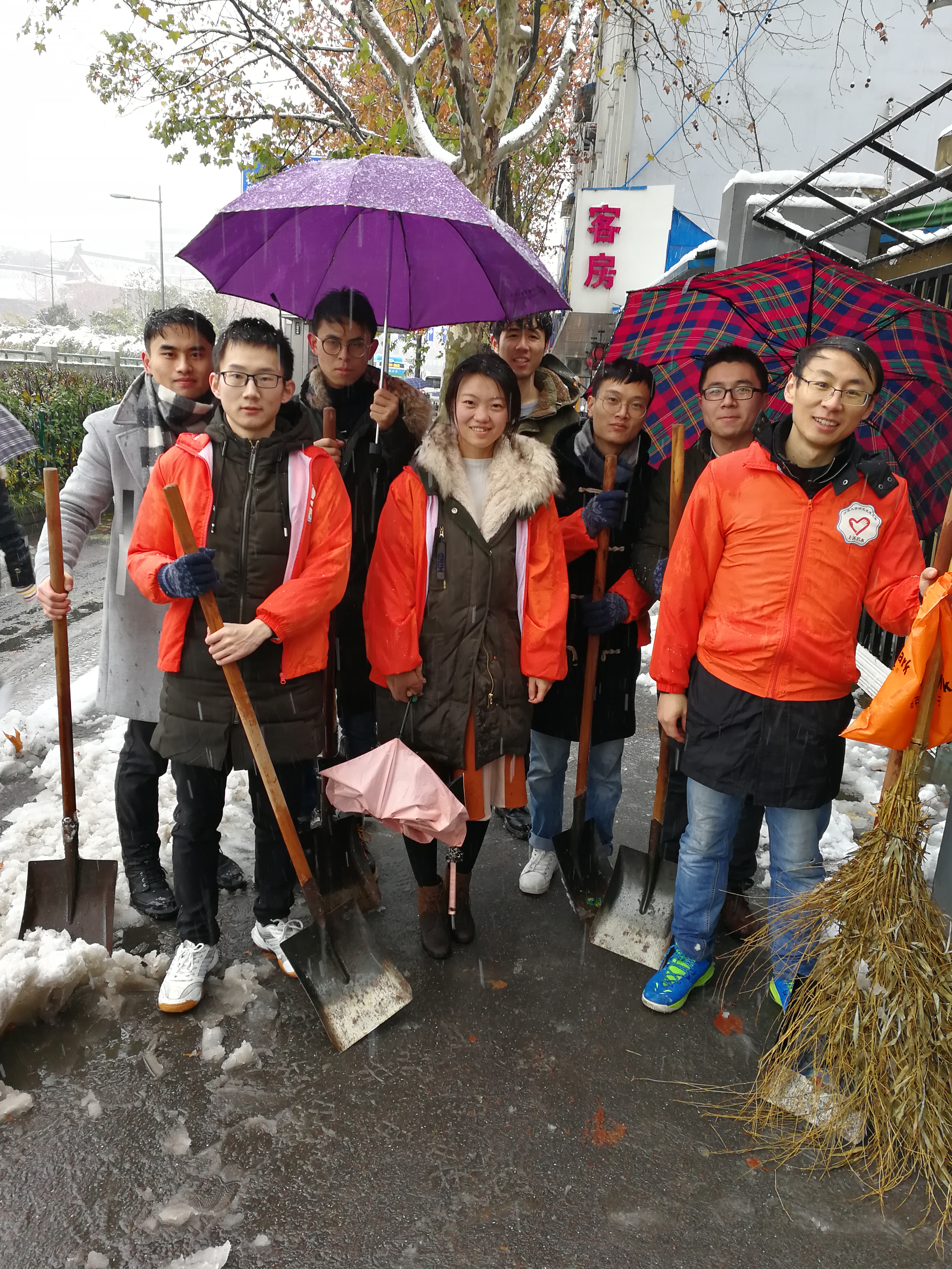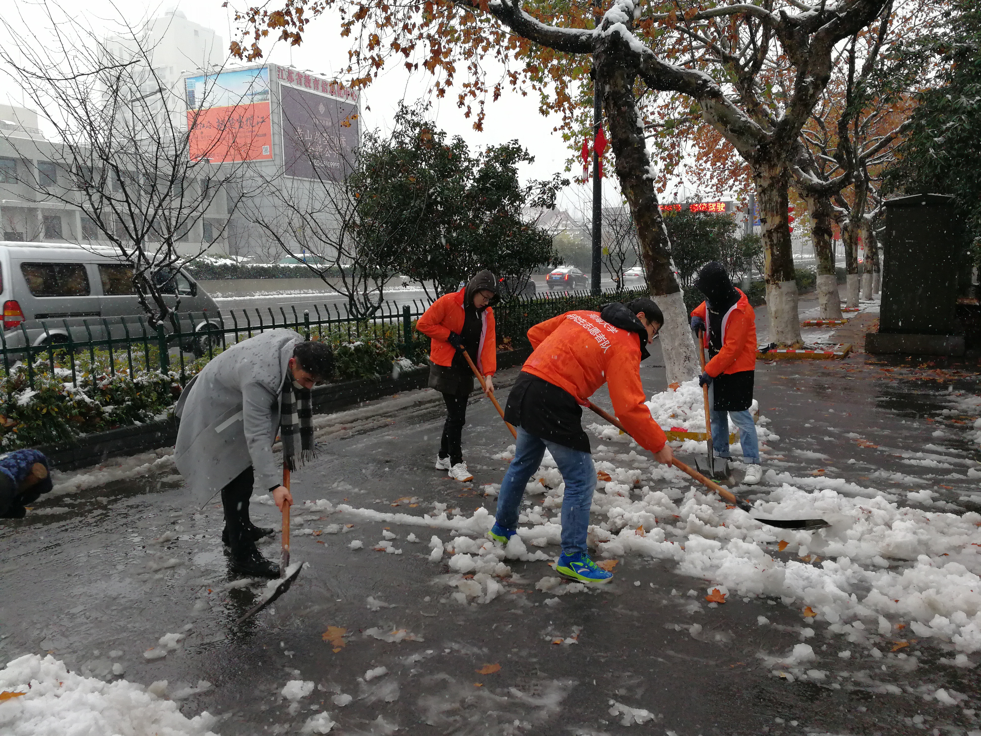为尽快消除积雪给学校道路交通带来的诸多不便,响应学校的号召,研会召集了一部分成员组成道路清雪志愿小分队,带着铁锹等扫雪工具,对污漫