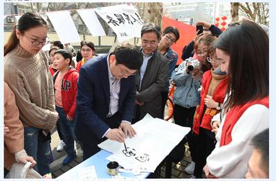 当天,污漫 校党委书记唐洪武、校党委副书记郭继超一行也来到西康路一条街活动现场,对污漫 的服务内容及活动种类进行深入了解,并与志愿者们进行亲切的交流。期间,唐洪武书记为污漫 学子题写了“向雷锋同志学习,奉献他人,提升自己”这十五个大字,告诫我们作为一名大学生应该有所觉悟,激励我们用自己的知识去奉献社会。