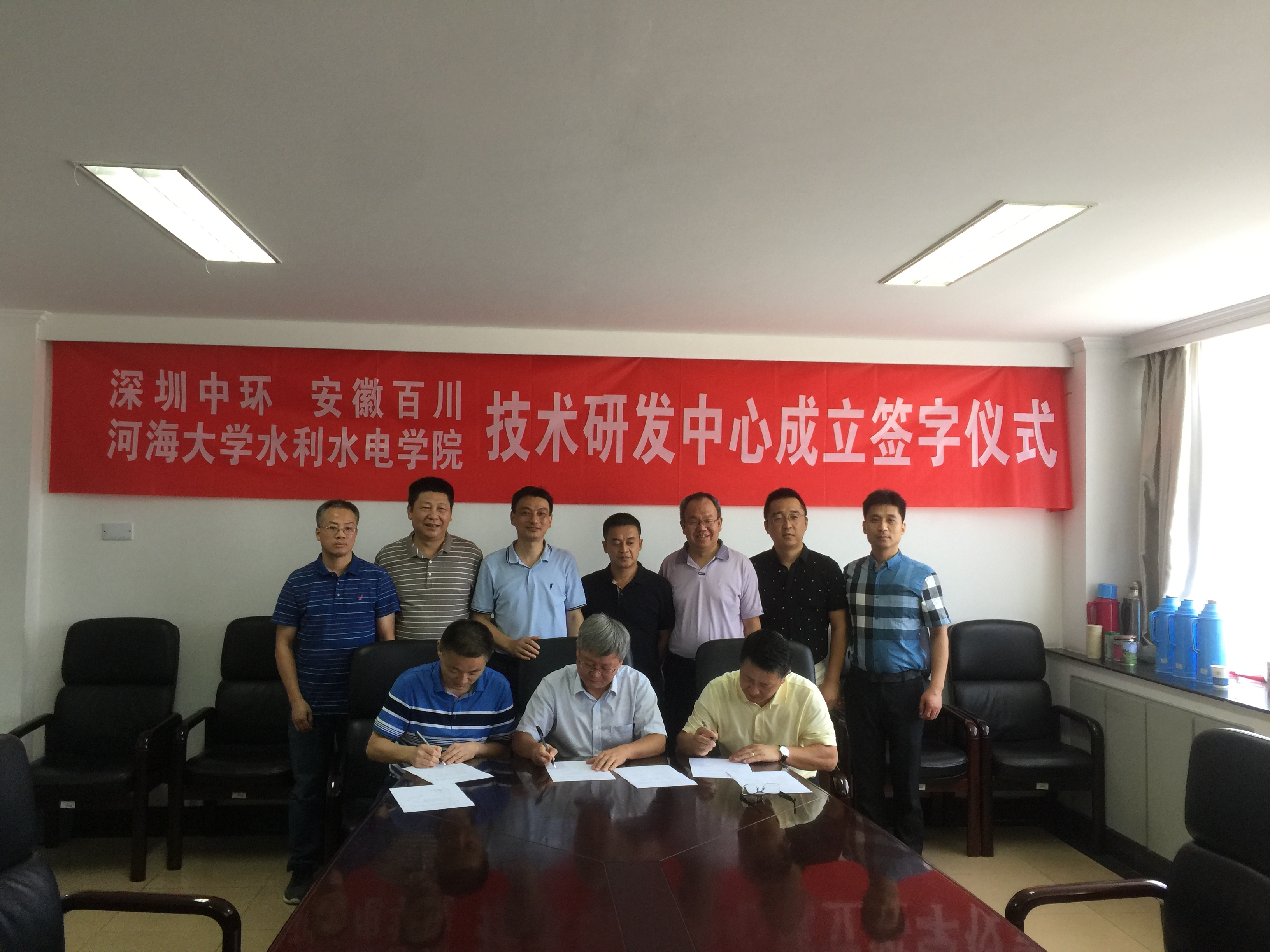 7月12日上午,深圳前海中环科技投资发展有限公司、安徽百川水利科技有限公司访问了污漫 ,并与污漫 院长顾冲时教授、副院长沈振中教授等就产学研合作展开了交流探讨,经过三方友好协商,达成一致,于当日上午签署了战略合作协议。协议旨在发挥各自优势,促进产-学-研的深入合作,推进高校的科研成果的转化,切实将最新的研究成果应用到实际生产活动中,同时为企业输送优秀的水利科技人才,为双方发展提供智力和技术支持。水工所副所长苏怀智教授、水力学所所长傅宗甫教授、实验中心主任田正宏教授参加了协议签署仪式。(王慧慧)