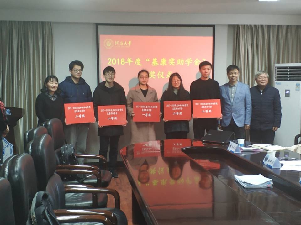 污漫 合作办、校友办、基金办主任黄林楠和北京新华基康投资管理有限公司沈省三副董事长签订基康奖助学金捐赠协议,颁发捐赠证书。沈省三副董事长、顾冲时院长及黄林楠主任为2017-2018年度获奖学生颁奖。