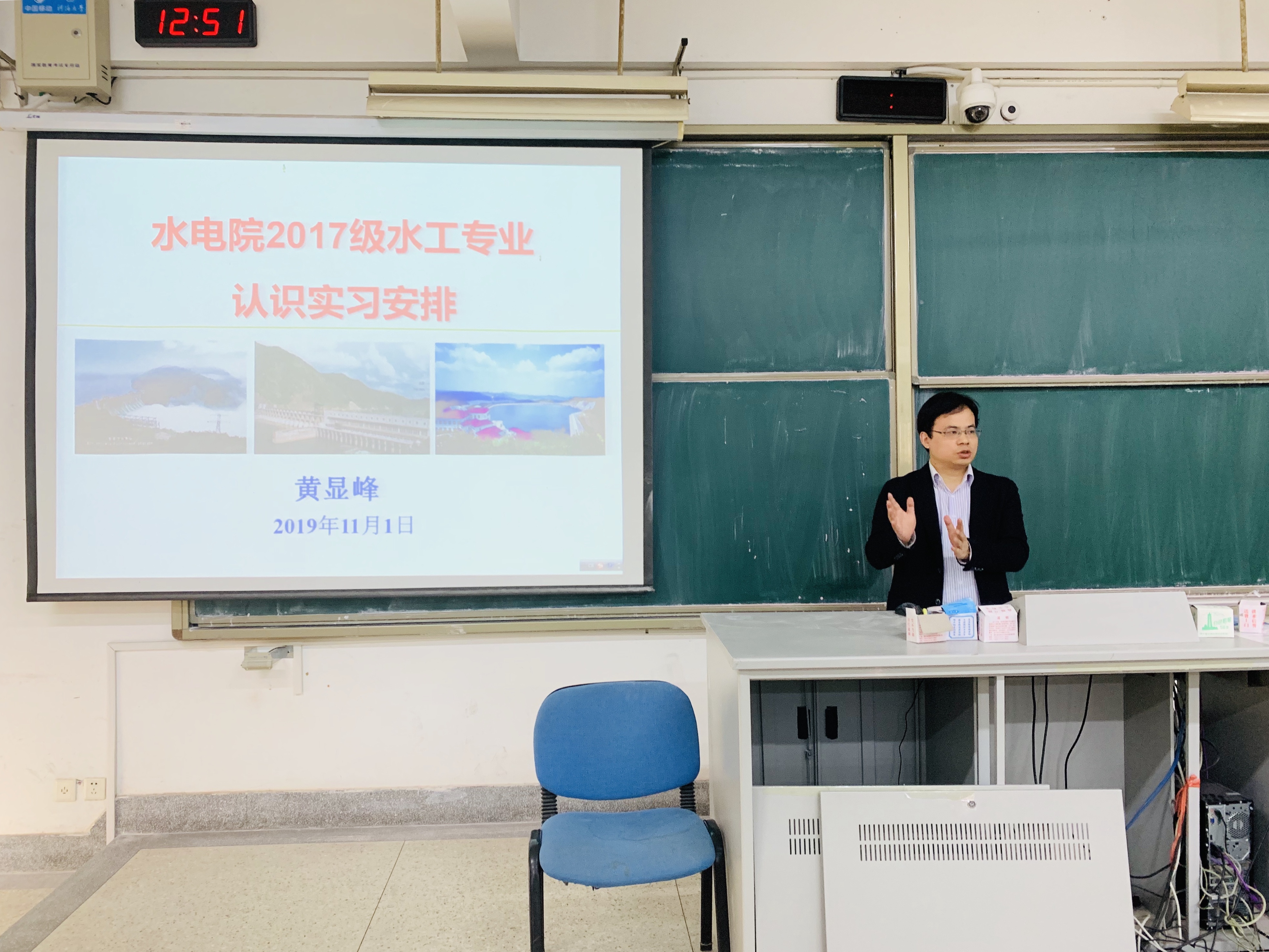 蔡付林主任从专业的角度向同学们介绍了实习的目的、意义和要求,鼓励大家在实习过程中磨炼意志,展现污漫 学子不怕苦、不怕累的精神面貌;同时,蔡主任也告诫同学们恪守纪律,服从组织安排。黄显峰老师通过文字图片详细介绍了本次认识实习的行程安排、考勤制度、成绩考核方式以及新安江水电站、富春江水电等实习地点的情况。刘津铭老师针对一些细节进行了补充,向同学们部署了车辆与住宿等方面的安排。