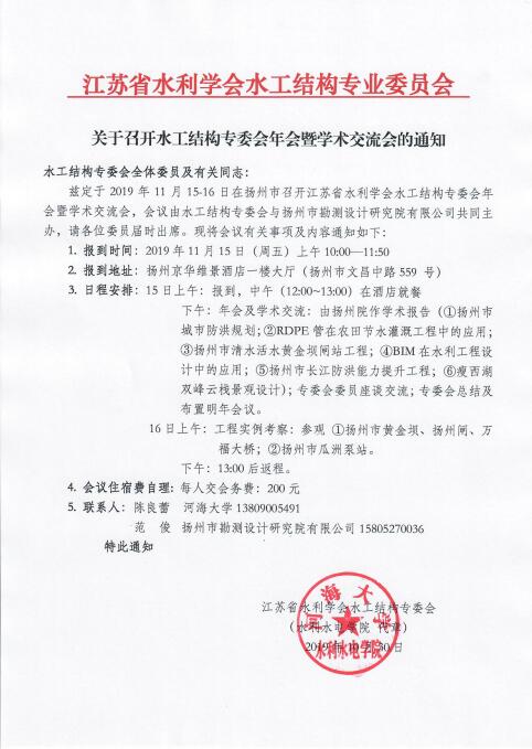 2019年11月15-16日,江苏省水利学会水工结构专委会2019年年会暨学术交流会在江苏扬州召开。会议由水工结构专委会与扬州市勘测设计院有限公司共同举办。来自我省各市水工结构专委会委员、科研单位、市水利局、水利学会的三十多位有关专家和技术骨干出席了本次会议。
