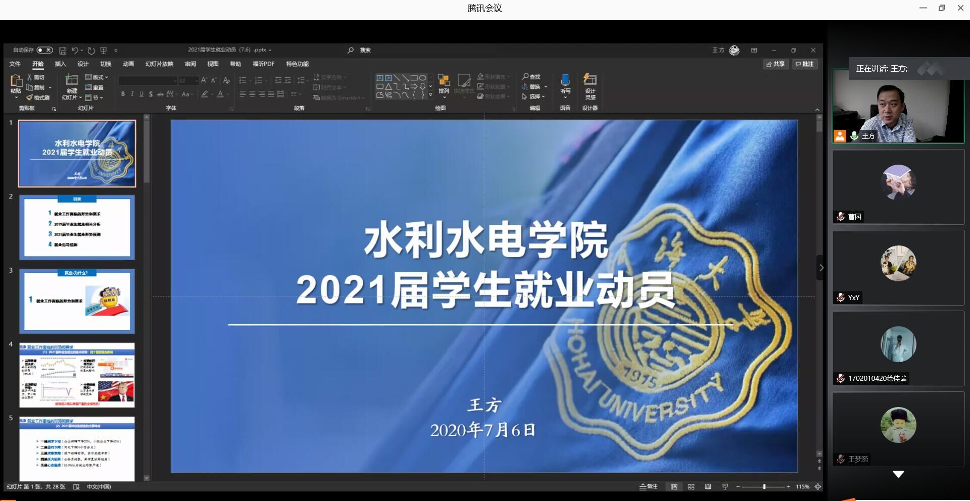 王方副书记介绍了当前就业工作面临的形势和要求,分析了2019及2020届毕业生就业情况。他强调,行动迟缓是大学生就业存在的突出问题,2021届毕业生应尽早明确生涯发展目标,规划就业方向,认清当前形势,调整就业期待,提前做好准备。王方副书记寄语全体学生以高标准严格要求自己,在暑期合理规划时间,安排学习计划,迎接新学期的到来。