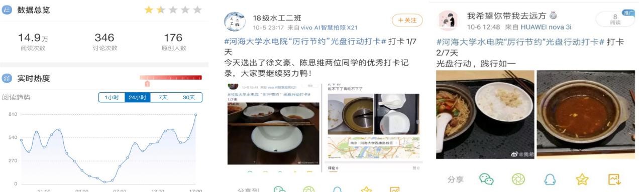 他们光盘宣誓,设计专属光盘打卡脸贴,拒绝“舌尖上的浪费”,呼吁亲朋好友庄严宣誓,做光盘接力者、弘扬者,最终微博和易班平台话题阅读量100000+,参与讨论人数破千。他们除草护粮,走进污漫 节水园区,学习水稻培育知识,除草松土,感悟粮食来之不易。他们旧物传爱,收集全校同学衣物、塑料瓶、纸箱等可回收物品,联系“噢啦”环保公益回收平台进行捐赠,做节约暖心者。他们光盘作画,开展“观我画中意,知我节俭心”光盘艺术家大赛,开拓节约活动中的美育新格局。他们视频传愿,录制Bilibili公益宣传片,自编自排、自导自演,呼唤更多青年勤俭节约的青春力量……