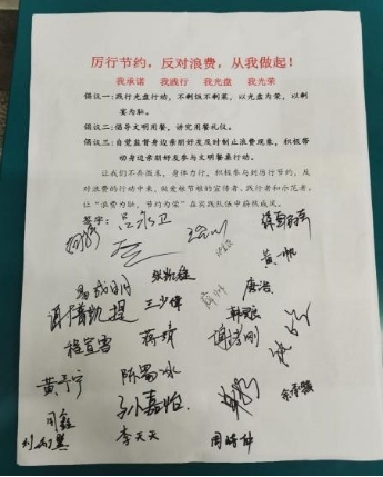 “一丝一缕当思来之不易,一粥一饭恒念物力维艰”。最后大家在厉行节约反对浪费承诺书上郑重的签下了自己的名字。