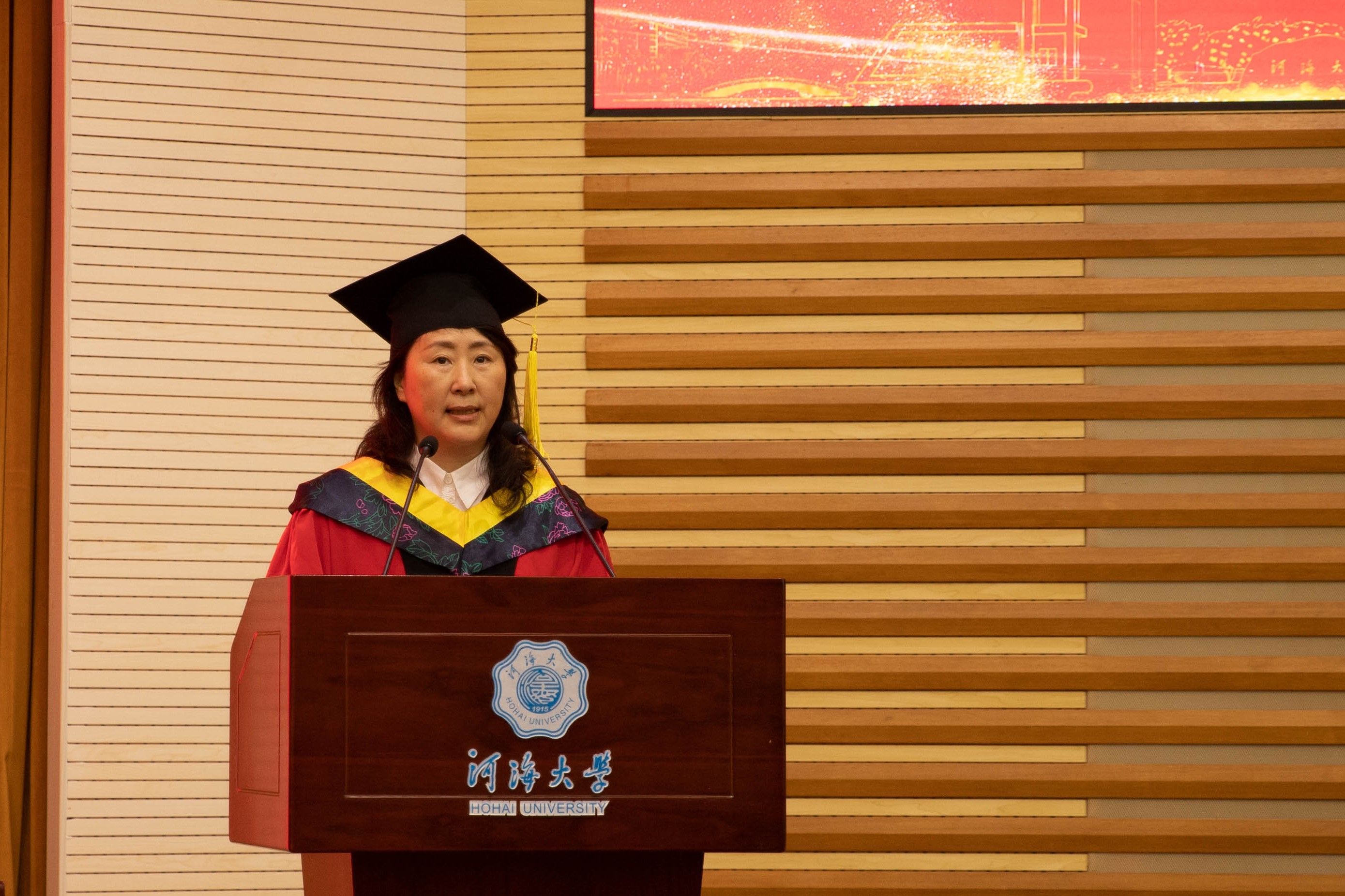 教师代表张汉云在发言中表达了对毕业生最衷心的祝贺对辛勤教学的老师们致以最崇高的敬意。与毕业生们分享了自己在河海的求学和工作经历,勉励广大毕业生在党的百年华诞之际,谨记和践行习近平总书记对新时代青年人的寄语,努力成为堪当民族复兴重任的时代新人。