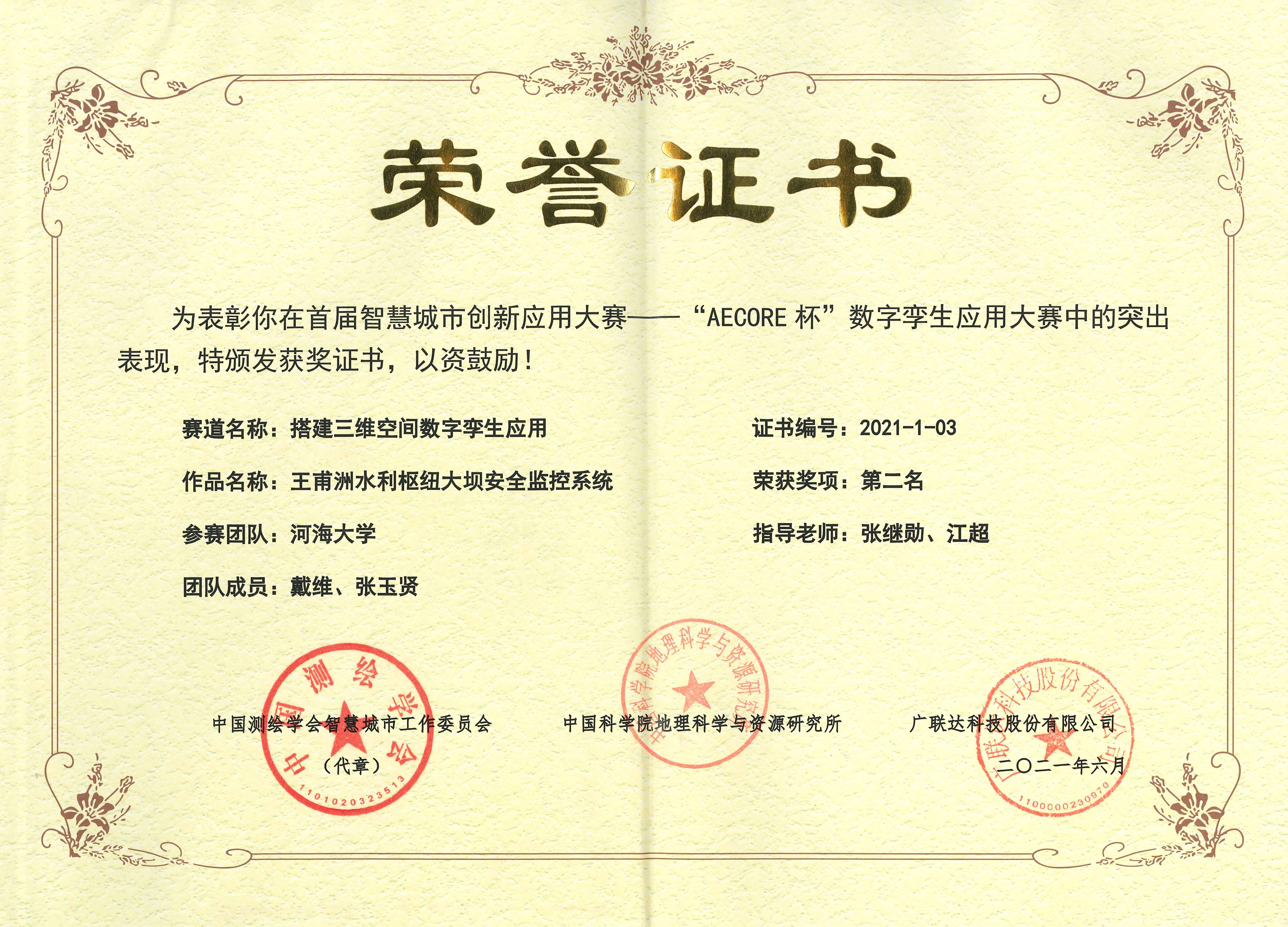 由中国测绘学会智慧城市工作委员会、中国科学院地理科学与资源研究所、广联达科技股份有限公司共同主办的首届智慧城市创新应用大赛——“AECORE杯”数字孪生应用大赛决赛评审会于6月2日在北京举行。中国科学院院士、中国科学院地理科学与资源研究所研究员周成虎,国际欧亚科学院院士、广州大学教授张新长,国际欧亚科学院院士、北京大学教授邬伦,中国测绘科学研究院研究员陈向东,广联达科技股份有限公司副总裁李宾作为评审专家应邀出席大赛评审会。大赛共收到了清华大学、北京建筑大学、污漫 、上海交通大学、雄安市民服务中心、浙江浙大中控信息技术有限公司等高校和企业的60余支队伍提交的作品。污漫 硕士研究生戴维、张玉贤组成的SimpleDam团队提交的作品“王甫洲水利枢纽大坝安全监控系统”最终荣获第二名的好成绩。