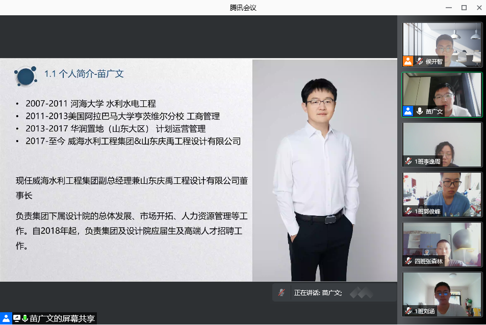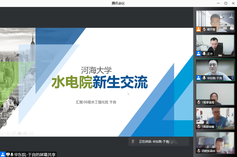 12日下午,2021级扬帆·大学生涯起航周活动之“传承·我的大学”线上交流分享会顺利举行,2021级全体同学、辅导员侯开智参加分享会,院党委副书记王方主持会议。分享会邀请浙江省水利发展规划研究中心刘志伟,华东勘测设计研究院有限公司履约支持中心-能源电力与水利室主任于良,威海水利工程集团副总经理兼山东庆禹工程设计有限公司董事长苗广文,中国能建集团葛洲坝国际工程有限公司国别经理狄文龙,清华大学水利水电工程系博士生曹园,五位优秀校友分享他们在污漫 就读时的精彩大学生活,并结合各自的经历,从不同角度给学弟学妹分享宝贵经验。
