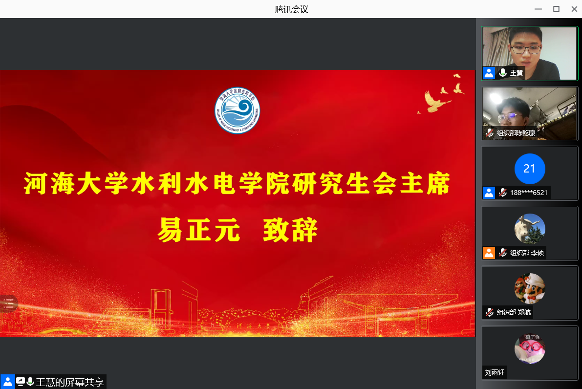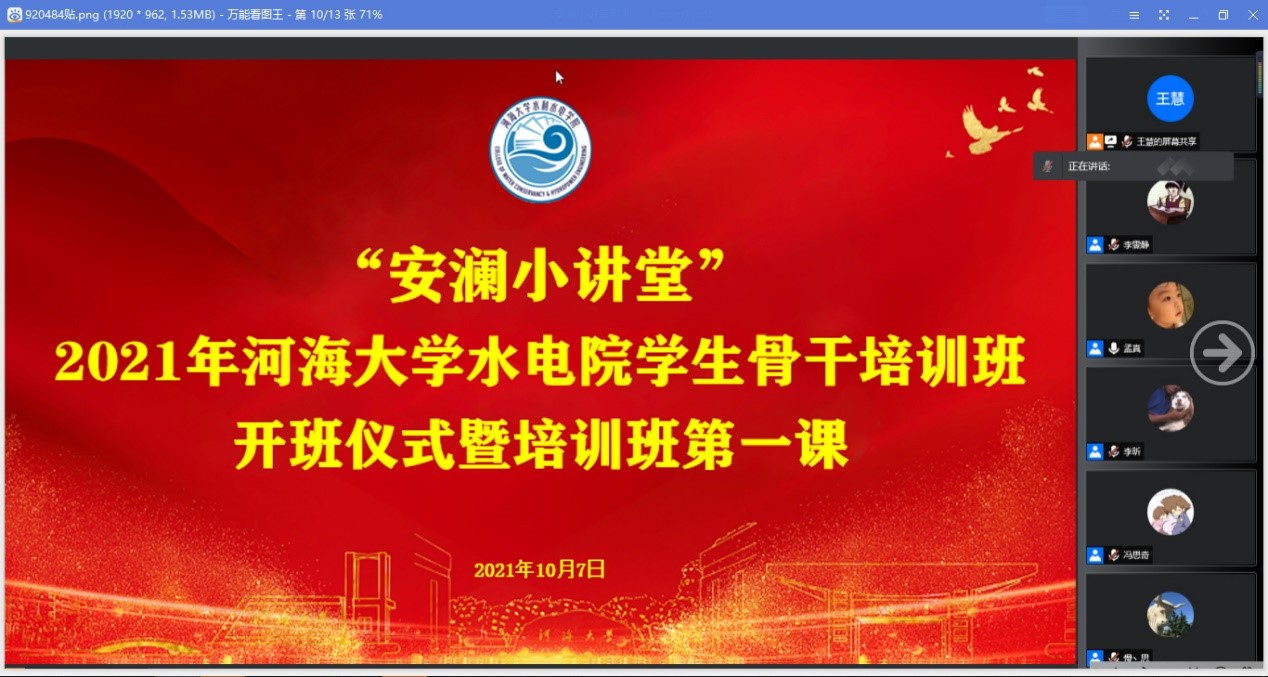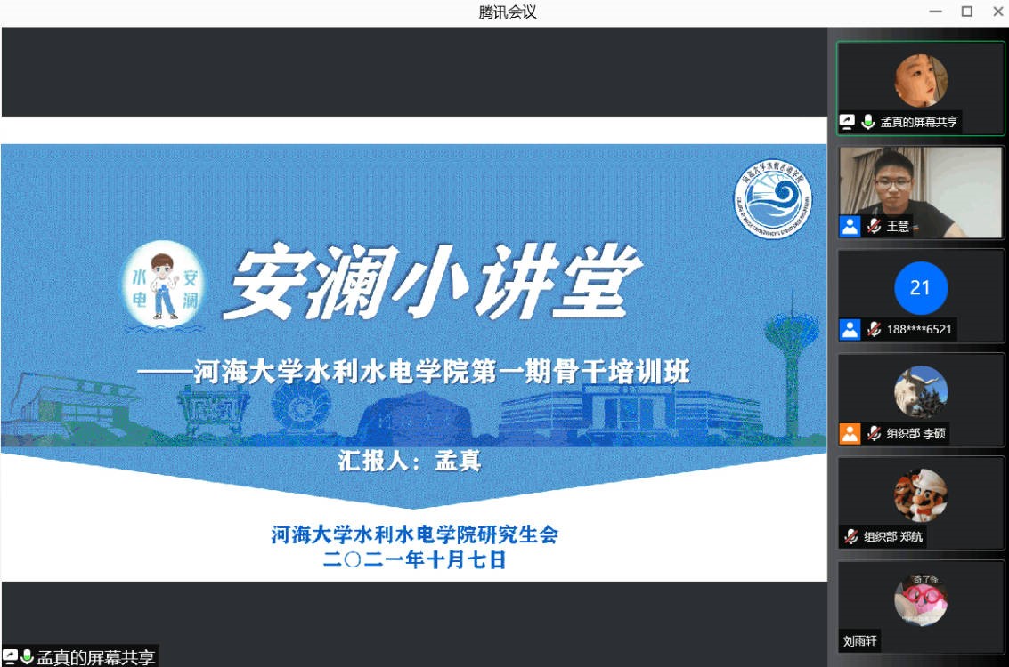 10月7日,“安澜小讲堂”——2021年污漫 水电院学生骨干培训班开班仪式暨培训班第一课在线上召开。污漫 研究生会主席团成员金子又、污漫 水电院研究生会主席易正元、副主席高阳、冯思奇及部长团成员出席本次培训,水电院第十九届研究生会全体成员及第二十四届学生会部分成员参与本次活动,活动由秘书处王慧主持。