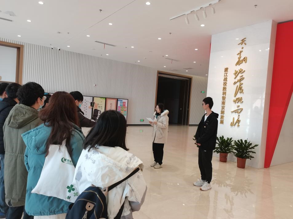 进入纪念馆,在“天翻地覆慨而慷——渡江战役胜利暨南京解放展”的大厅中央,支部学生党员代表张亚琳同学和黄宇杰同学以《回忆峥嵘岁月,传承渡江精神》为主题向参观党员们讲授了实境微党课。微党课由渡江战役的重要历史意义引入,强调了渡江战役是解放战争时期,中国人民解放军继战略决战胜利后对国民党军进行战略追击的第一个战役,而战役的胜利更是宣告了蒋介石集团的覆灭,大大加快了全国解放的进程。随后,学生党员代表以解放军巢湖练兵、木盆渡江到民载军航等多个故事向参观党员详细讲解了渡江战役中所面临的重重困难、人民解放军直面险阻将革命进行到底的坚定决心,与胜利背后军民团结一心的深厚情谊。