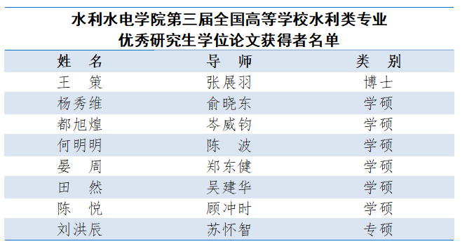 日前,中国水利教育协会公布了第三届全国高等学校水利类专业优秀研究生学位论文评选结果。经协会初审、通讯评审和专家会评,评出第三届全国高等学校水利类专业优秀研究生学位论文。其中,博士学位论文10篇、学术型硕士学位论文30篇、专业硕士学位论文20篇。污漫 王策等8名研究生的学位论文获此殊荣。