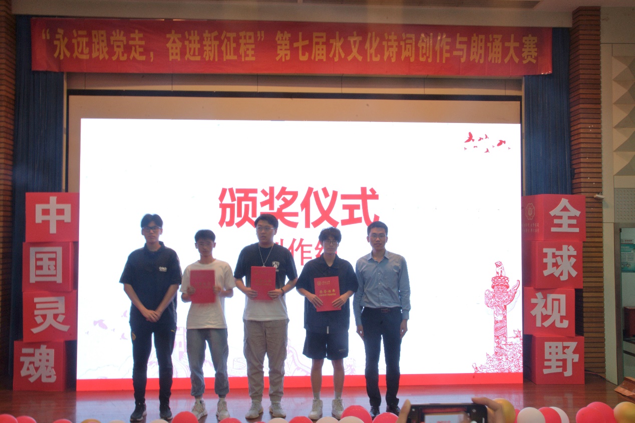 来自河海里尔学院的燕虹夜雨创作的《水韵流长》、来自农业科学与工程学院的段正宇和来自公共管理学院的沈雨桐共同创作的《月夜江边信步》、来自理学院的李耀创作的《夜雨所寄》、来自环境学院的楚嘉欣创作的《且行》、来自河海里尔学院的乔越瀚创作的《八声甘州·念党》、来自理学院的于明瑞创作的《归渡曲》、马克思主义学院的董文浩创作的《红色的洪流》获得了创作组三等奖。