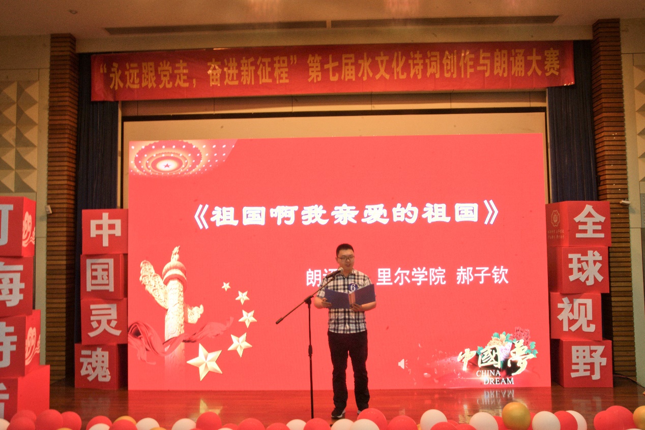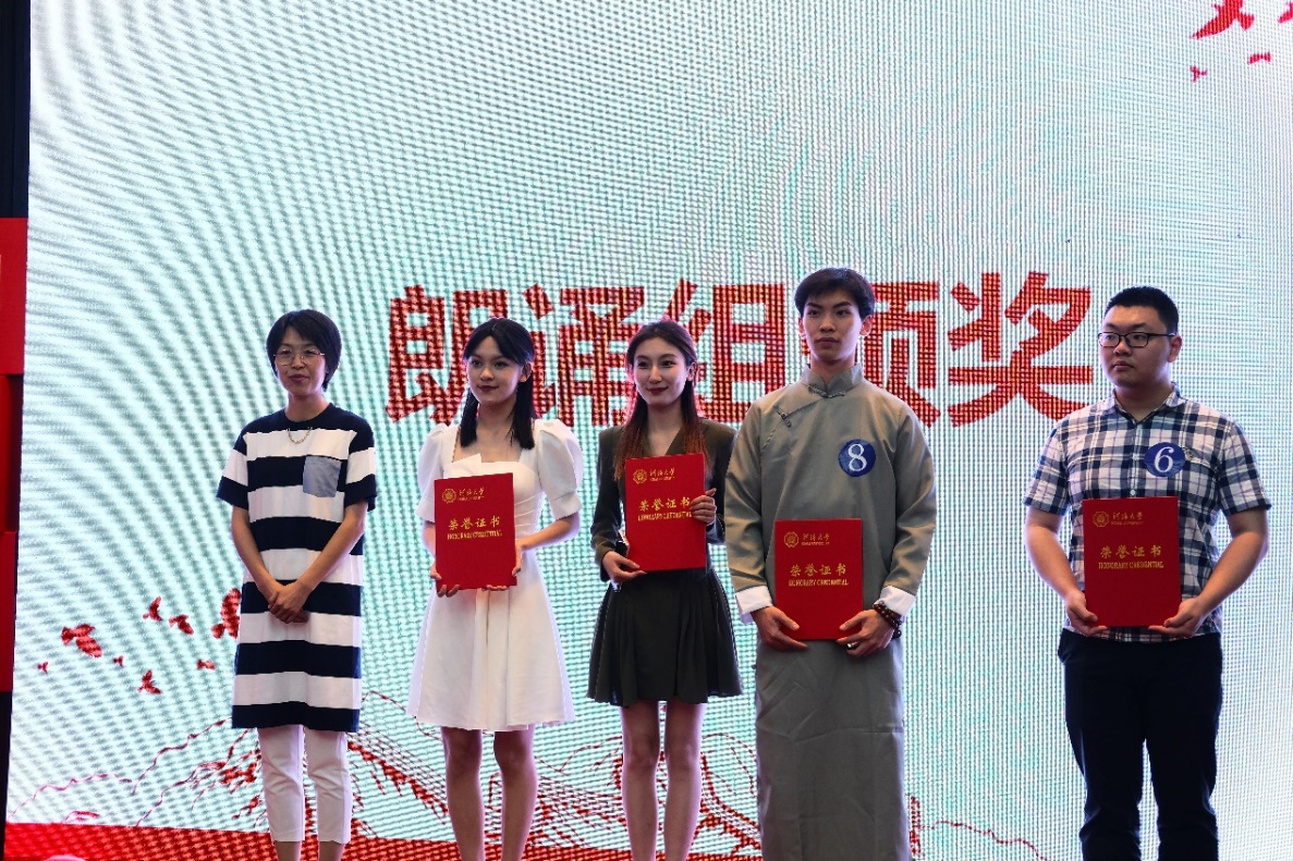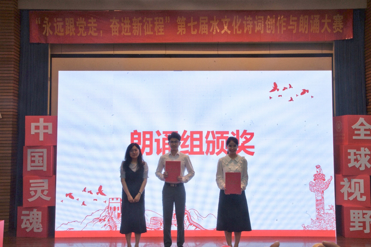 经过现场评委的打分,最后来自公共管理学院的陈永长、陈宇翔、李昕臻朗诵的《少年中国说》获得了朗诵组一等奖。来自公共管理学院的王嘉瑞、朱姿宣朗诵的《闪耀吧!青春的火光》,公共管理学院的刘雨慧、谢咏儿朗诵的《治水兴邦水利人》获得朗诵组二等奖。来自公共管理学院的陈一艳、杜骏朗诵的《我们同是水利人》、来自河海里尔学院的郝子钦朗诵的《祖国啊我亲爱的祖国》,来自公共管理学院的沙雨桐、朱欣怡、张轩萁、郑柏宇朗诵的《唐诗里的中国人》获得朗诵组三等奖。