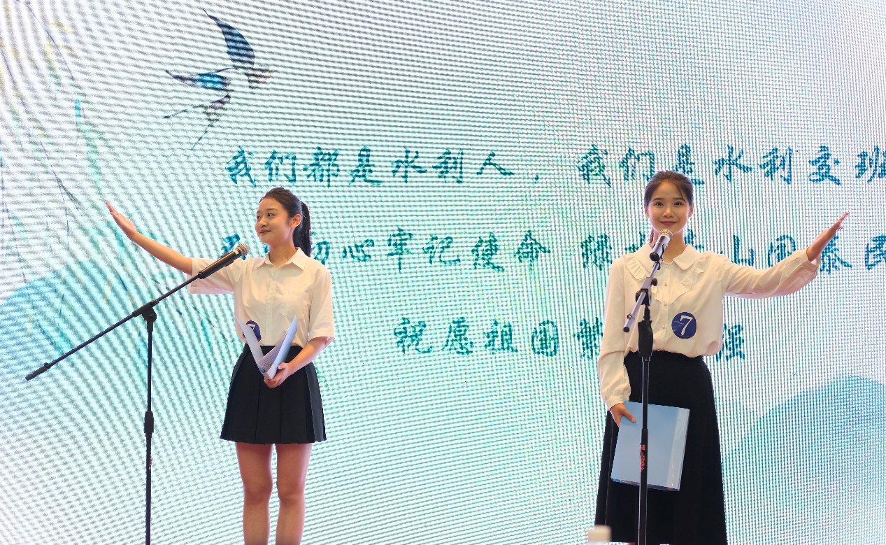 本次大赛分为创作组和朗诵组,吸引了来自水电、公管、外语、大禹等多个学院的同学踊跃参与,经过朗诵作品及创作作品的线上专业评审,最终有10组朗诵组选手以及创作组的13名选手进入决赛。比赛中,选手们声情并茂、饱含感情地朗诵了《水利的春天》、《我们同是水利人》、《闪耀吧!青春的火光》、《祖国啊我亲爱的祖国》等多首作品,歌颂了新征程的宏伟蓝图以及在建设事业大力转型下我国水利事业发展取得的巨大成就,选手朗诵时传达出的对于家国和水利事业的赞扬和热爱,让现场的观众深受鼓舞,掌声热烈。