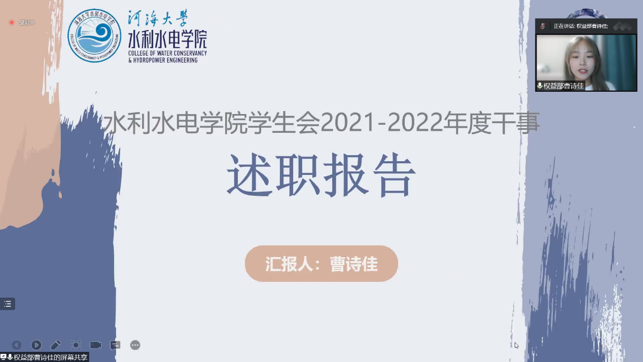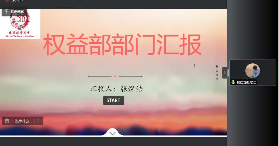 权益部张煜浩同学介绍了本学年部门举办的门牌秀、权益风暴、“三·七女生节”等活动,充分展现出了权益部的担当与风采,他们润物细无声地为水电学子提供各种必要服务,并积极为其做好权益保障。