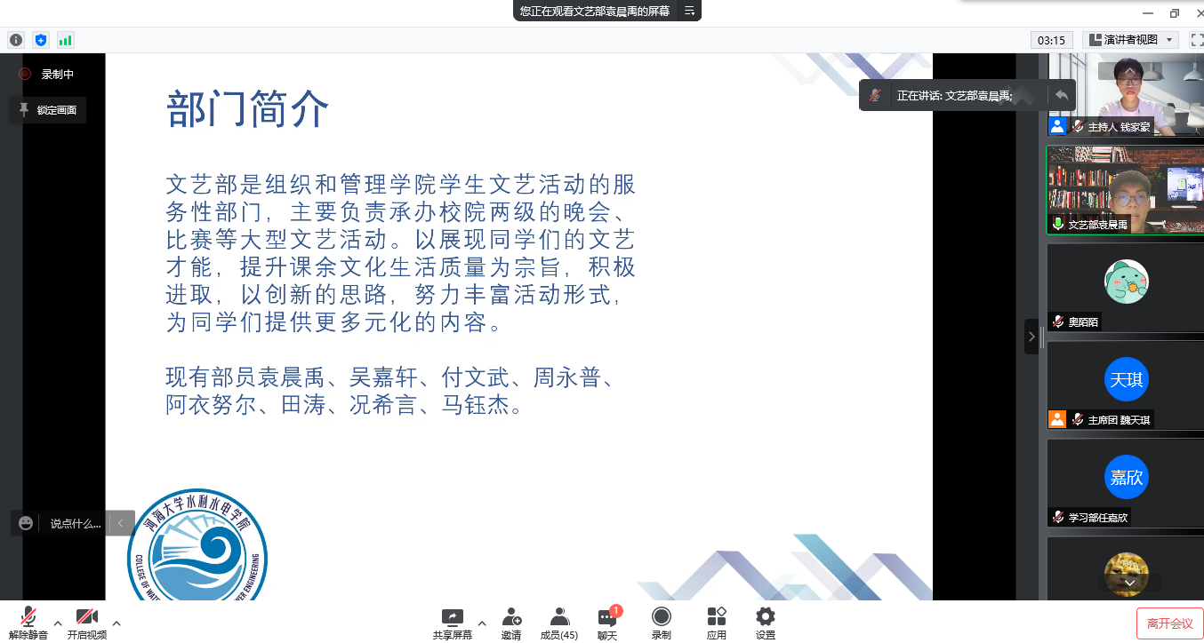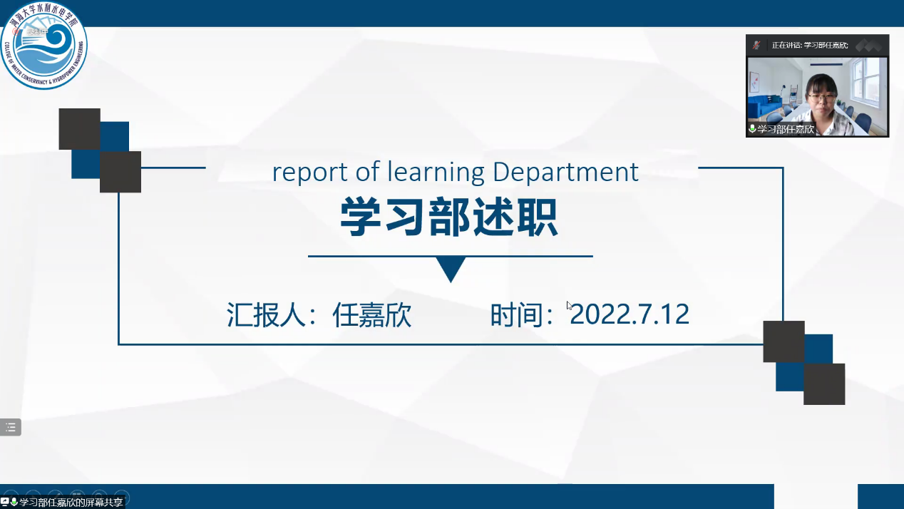学习部任嘉欣同学介绍了学习部在“刻苦,严谨,求实,创新”的宗旨下开展的各类知识讲座和学习经验交流会,为水电学子们搭建了思想碰撞和学习交流的平台。