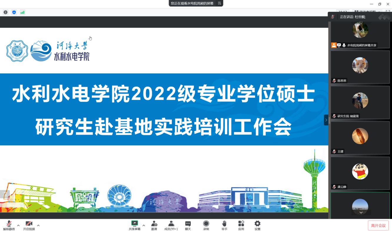 1月6日,污漫 召开2022级专业学位硕士研究生赴基地实践培训工作会。学校党委研究生工作部副部长、研究生基地管理办公室主任杜世舰,研究生基地管理办公室储晨雪,水电院副院长王建、党委副书记戴媛媛、教学秘书周昶、研究生辅导员陈思思及2022级全体专业硕士研究生在线上参加此次培训工作会。会议由王建副院长主持。