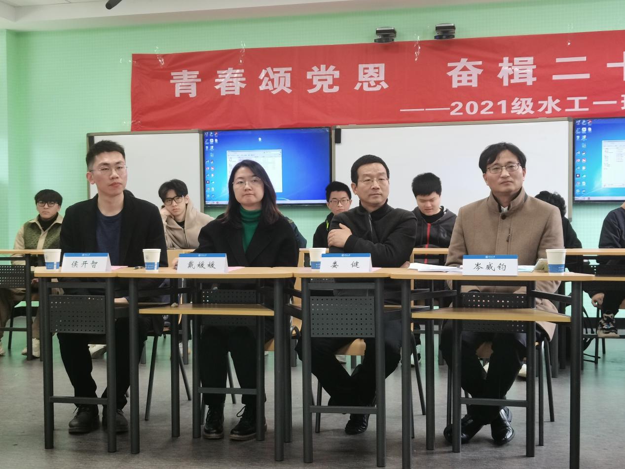 本次班会,水工1班班长郭俊峰汇报班级整体情况陈贤博、黄竣沣、陈轶骁、宋金俞、方越、李茜分别就“爱国”、“团结”、“奋斗”、“科学”、“互助”、“反诈”主题进行演讲同学们联系生活实际,分享学习践行党的二十大精神思考感悟在交流座谈环节上,针对班级同学提出的各类问题,娄健书记、戴媛媛书记、岑威钧老师详细解答了同学们提问