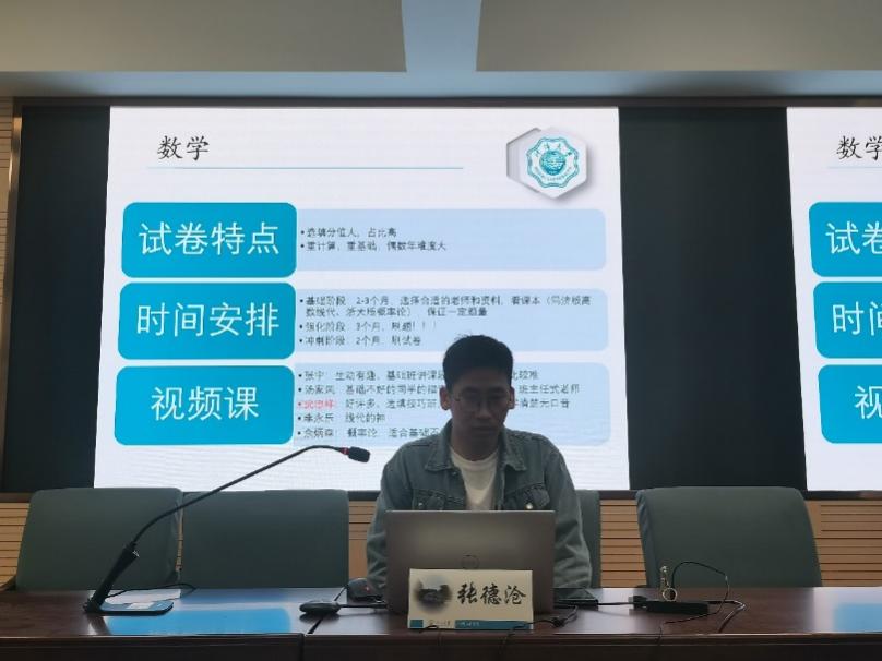 张德沧从研究生专业选择、历年考研分数、考研试卷特点、复习时间安排等方面为同学们进行了详细的介绍,分别从数学、英语、政治、专业课给出了关于备考书籍选择、学习资料推荐和个人刷题技巧的建议,提醒同学们要完善考研计划、养成良好习惯、坚定备战考研。