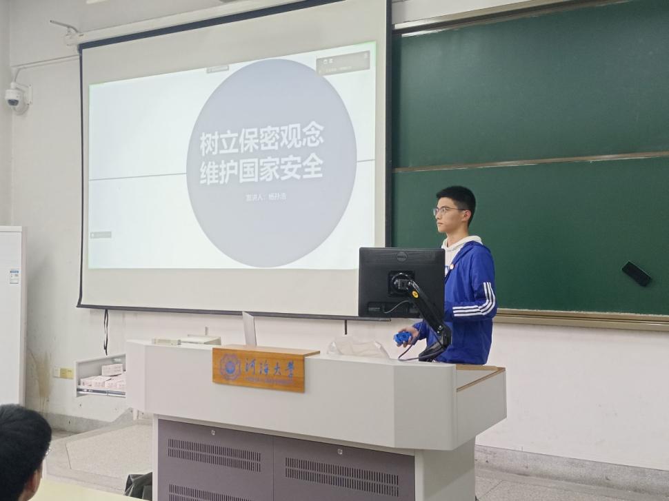 杨孙浩同学进行“团结奋斗新征程,保守秘密靠大家”主题团课,全面介绍维护国家安全的重要性,以鲜明的案例、系统的阐述,带领大家树立维护国家安全的意识,分享关于保守秘密的建议,提醒同学们注意生活中的泄密陷阱,筑牢维护国家秘密安全的校园防线。