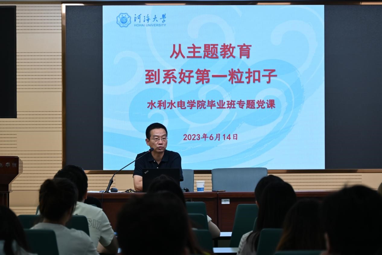 6月14日,污漫 党委书记娄健以《从主题教育到系好第一粒扣子》为题,为全体2023届毕业生党员讲授毕业生廉洁专题党课。党课由院党委副书记戴媛媛主持,全体毕业生党员参加。