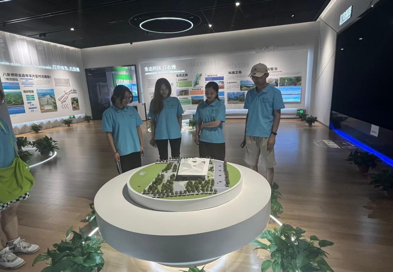 在南京滨江规划建设展示中心,实践团成员按照展馆内“一江两岸”过去、现在与未来的顺序,进行参观学习。了解到我们的实践侧重点,讲解员特意带领成员们仔细参观了展示中心的沙盘厅。在这里,成员目睹了南京滨江段1:1100比例的复刻场景模型。通过讲解员的介绍与现场模型的观察,成员们对南京长江大保护成就得到进一步了解,也对滨江城市的生态环境治理方式有了进一步的领悟。