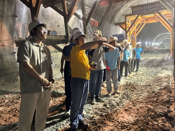 在丹江口大坝下游汉江右岸安乐河口,博士团跟随长江设计集团引调水院余义华主任和武松博士进入引江补汉工程出口段主体隧洞内调研,观察了输水隧洞钻爆法作业面衬砌支护施工过程,了解了隧洞开挖在面临强岩爆、突泥涌水、软岩大变形等问题时的具体处置方案。在桐木沟检修交通洞,博士团深入隧洞内近500m,进一步观察了沿线Ⅲ类和Ⅳ类围岩所采取的不同支护措施。之后博士团还观摩了引江补汉工程出口段数字孪生智能建造中心,学习了“智慧工地”、“数字孪生建设”的具体实践。
