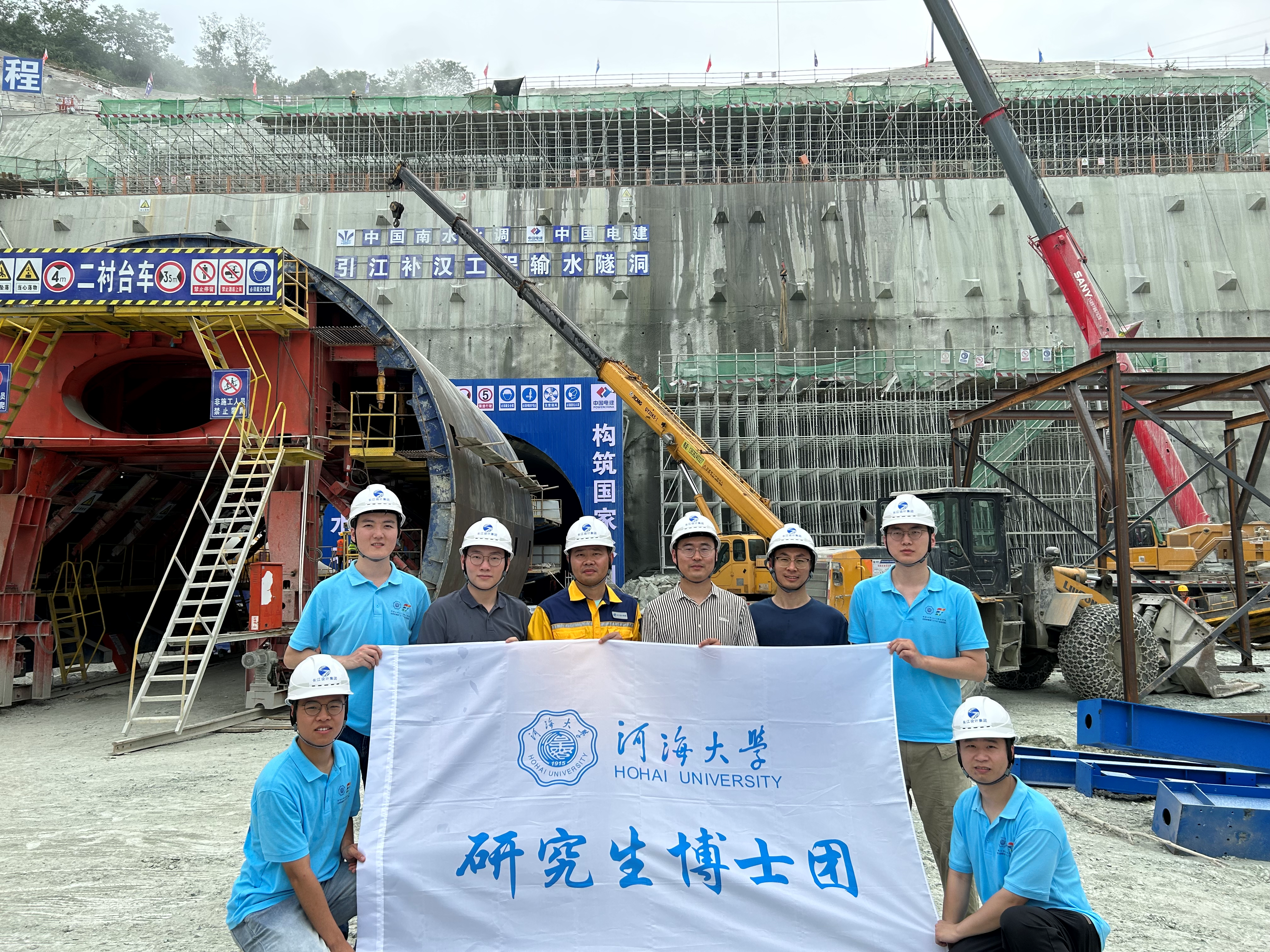 博士团在引江补汉工程出口段合影 | 博士团观察衬砌支护施工作业面 |