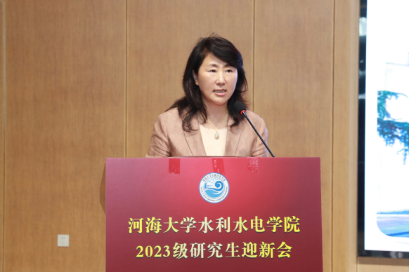 王媛院长代表全体师生员工向2023级新同学的到来表示热烈欢迎和衷心祝贺。她从学院历史、学科建设等方面介绍了污漫 丰硕的办学成果和雄厚的科研实力。她指出要心怀“国之大者”,勇立时代潮头,守护江河安澜,做信念坚定的研究者;要练就过硬本领,自觉担当重任,做脚踏实地的躬耕者;要牢记河海校训,坚持守正创新,做水利精神的传承者。她提到,要以实际行动践行新时代水利精神,成长为祖国和人民最需要的新时代水利人才。