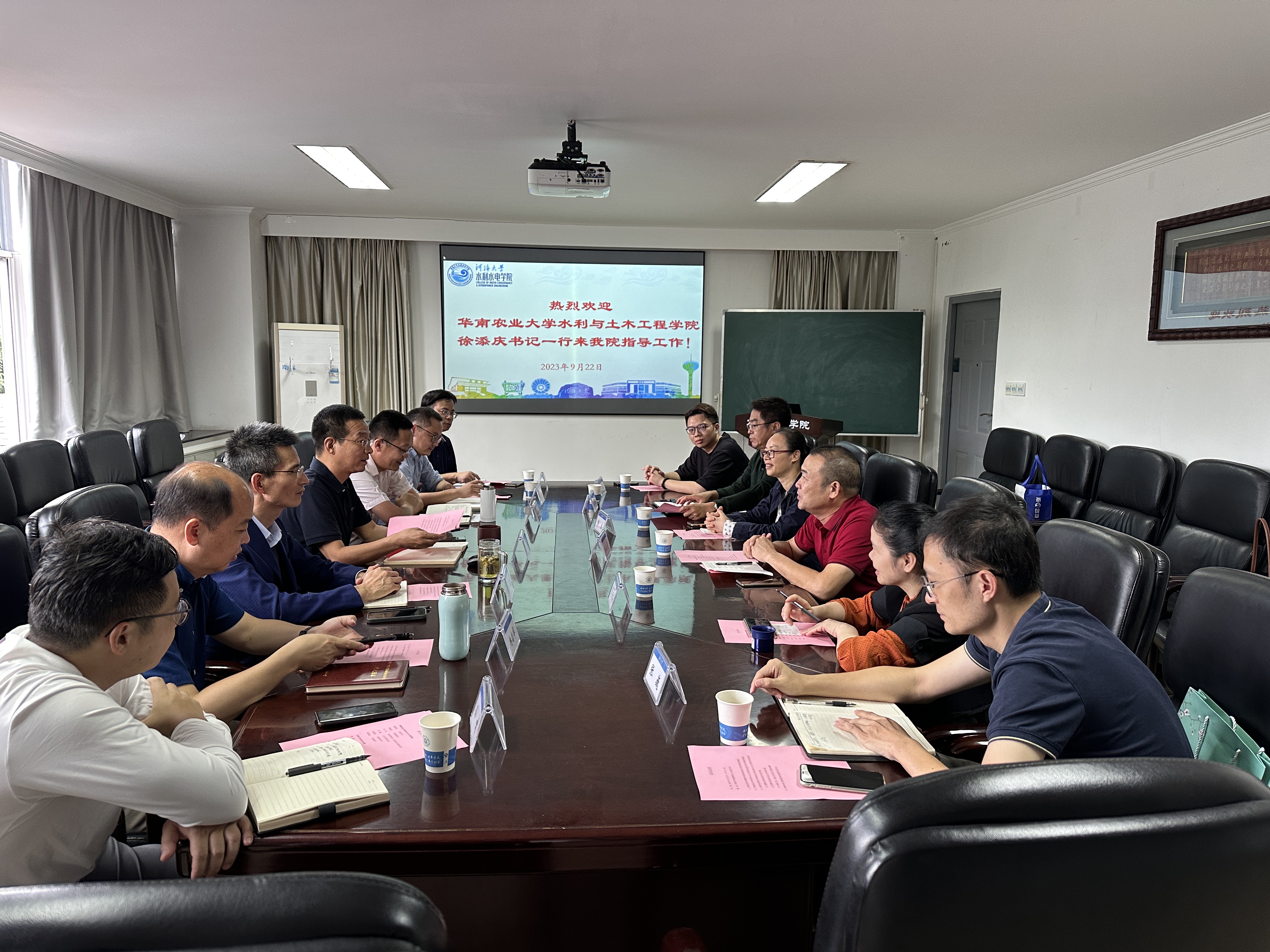 9月22日,华南农业大学水利与土木工程学院党委书记徐添庆、副院长李庚英、副院长韦未等一行6人来污漫 开展调研交流。学院党委书记娄健、副院长王建、副院长冉启华、副院长赵兰浩以及智慧水利系主任俞晓东、水利水电工程系黄显峰、智慧水利与智能减灾研究所副所长孙啸等参加调研交流会。