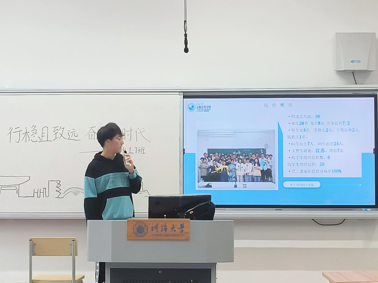 班长宋军鑫就班级概况、班委会建设和班内建设三个方面对水工7班大一学年班级建设情况进行总结汇报,展现了一个具有良好学习风貌与积极向上氛围的班集体,并激励同学大二学年继续脚踏实地,行稳致远。