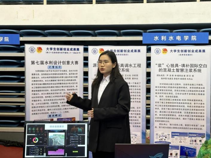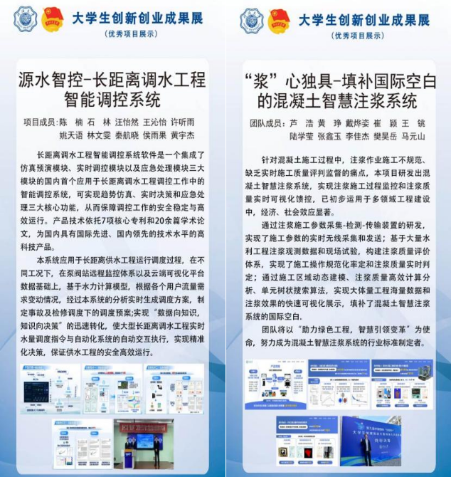 闭幕式上,污漫 展示了第七届水利设计创新大赛、第十七届“坝气十足”坝型设计大、第八届全国大学生水利创新设计大赛等赛事情况及部分获奖作品,展示了“互联网+”、“挑战杯”获奖项目《源水智控——长距离调水工程智能调控系统》、《“浆”心独具——填补国际空白的混泥土智慧注浆系统》等优秀创新创业成果。