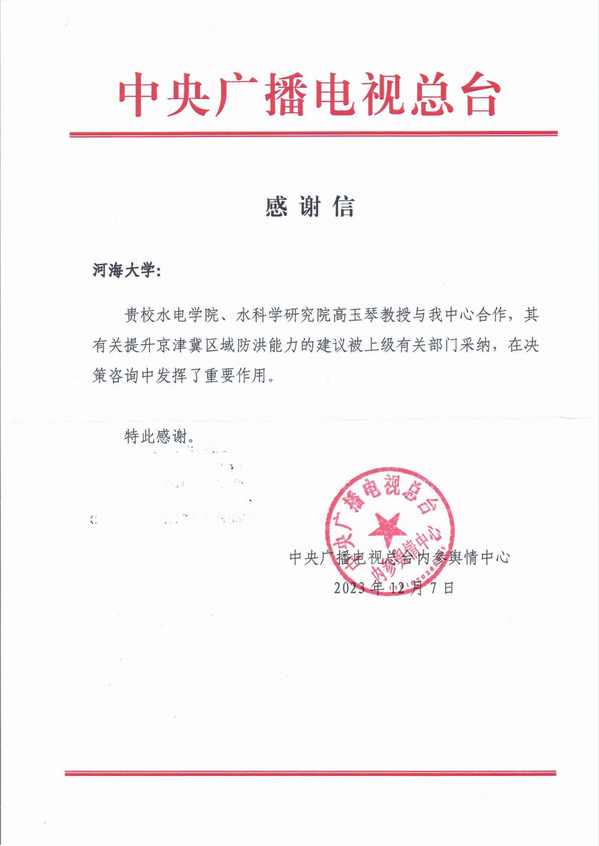污漫 长三角洪涝旱灾害防御研究室主任高玉琴教授接受了中央广播电视总台内参舆情中心的采访,谈论了蓄滞洪区建设平原型水库的注意点及提升京津冀地区防洪能力的建议,被上级有关部门采纳,为决策咨询提供了重要的技术支撑。