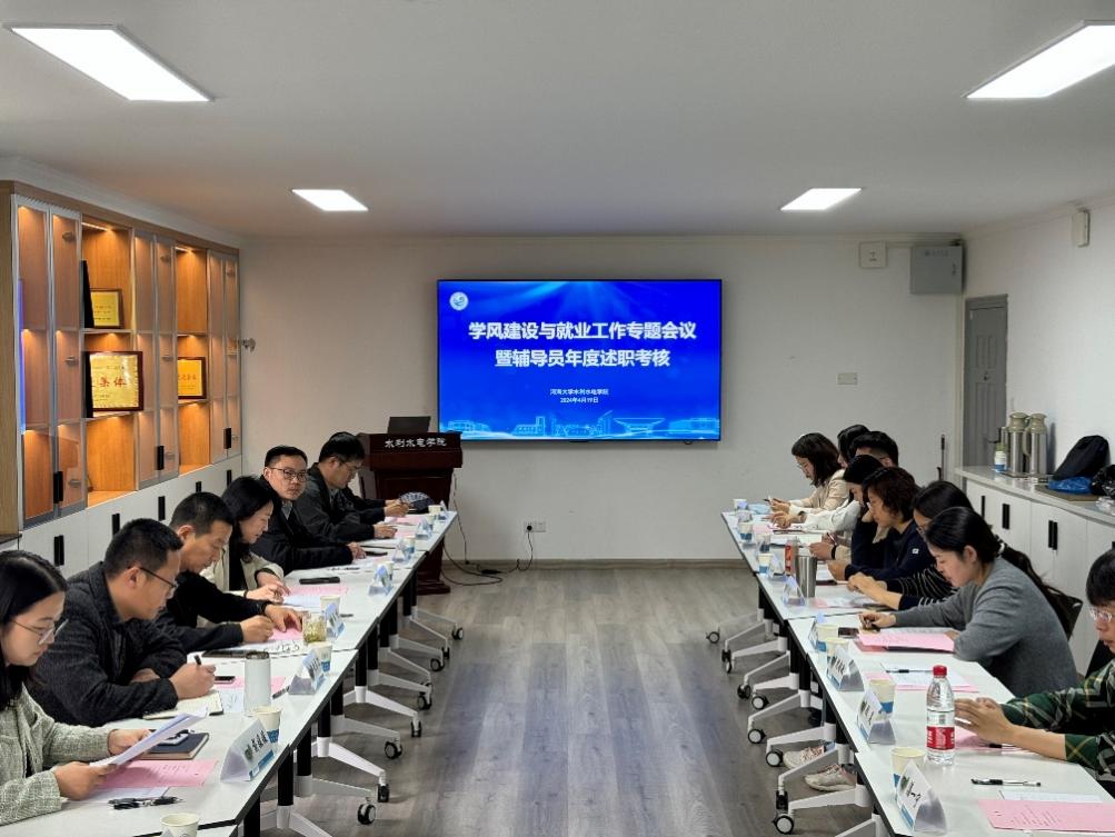 4月19日,污漫 举办学风建设与就业工作专题会议暨辅导员年度述职会议。院领导班子成员、各系所长、教师支部书记、班导师、辅导员与学生代表参加会议。会议由学院党委副书记戴媛媛主持。