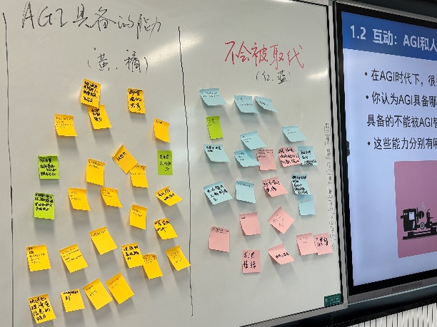 第二环节,“你认为AGI具备哪些能力”和“哪些是人具备的不能被AGI取代的能力”的讨论交流,同学们踊跃参加,归纳出AGI具备数据分析与处理、搜集信息和处理信息等能力,但不能取代人的创新性、道德伦理、情感交流等能力。姜帆老师由此提出“AI+人的组合是未来职业世界的趋势,能够提升未来跨界发展能力”的观点,点明AGI时代对职业产生影响的原因。