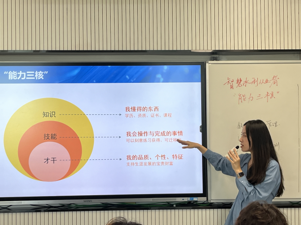 第三环节,姜帆老师提出“能力三核”的概念,即知识、技能、才干,并以智慧水利工程师的招聘要求为例,同学们辨析并明确知识、技能、才干的内涵,充分了解了智慧水利对人才的要求,通过探讨,交流大学提升自我能力的各种资源。
