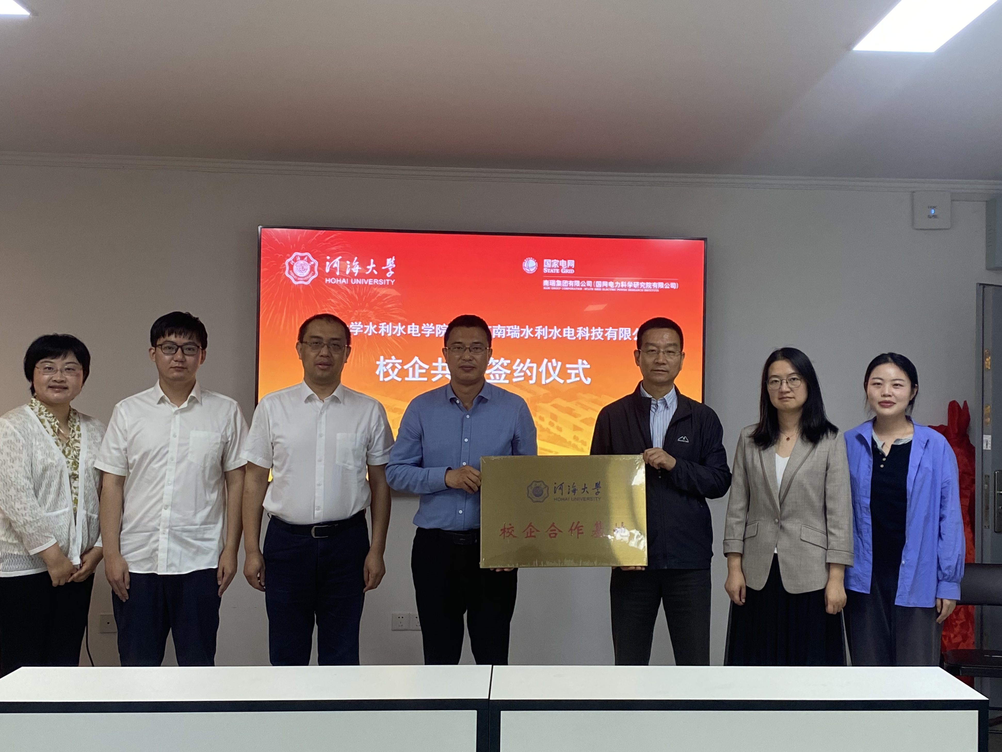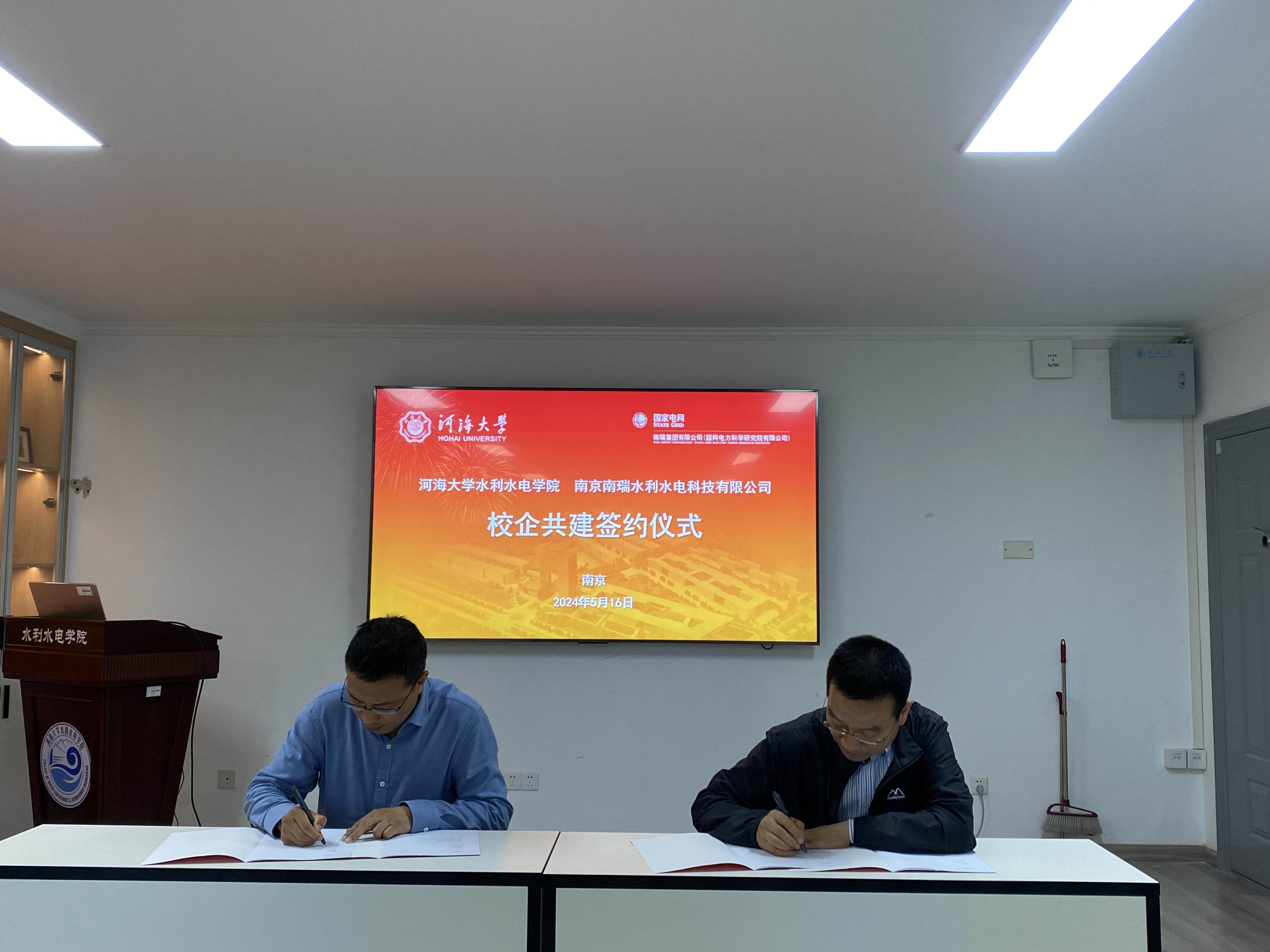 在与会人员的共同见证下,污漫 与南瑞水利水电科技有限公司签订校企共建框架协议并为“校企合作基地”揭牌。
