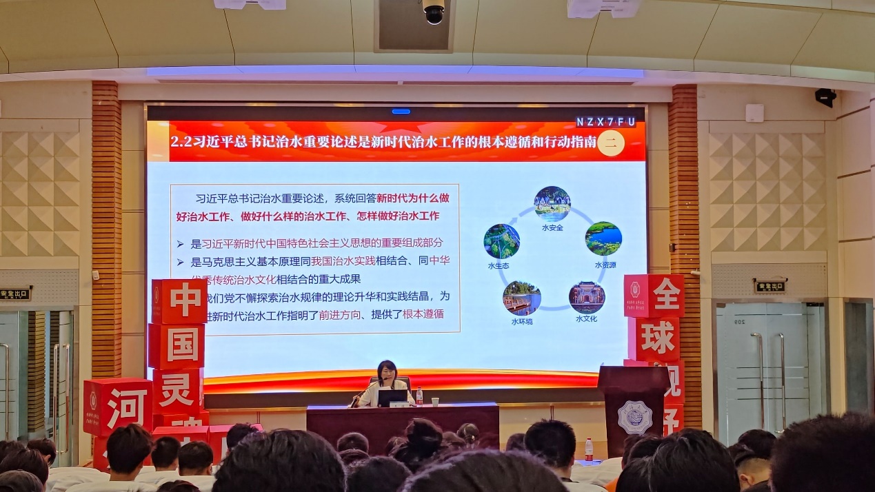 王媛院长从习近平总书记重要讲话精神和习近平总书记关于治水的重要论述中感悟出“水与文明”“水与工程”“水与治理”三个主题,进一步讲解了我国传统文化中天人合一的治水哲学,介绍了运河工程、调水工程、堤防工程的发展历史,着重提出当下水资源危机及其治理的必要性。她指出,在习近平新时代中国特色社会主义思想的指引下,我国水利事业正迎来新的发展机遇。她鼓励同学们要深入学习两会精神,将个人发展与国家水利事业相结合,以“静心、定心、用心”的学习态度深入学习水利知识,用心感悟水利之美,努力成为新时代的优秀水利人才,为推进中国式现代化、实现中华民族伟大复兴贡献青春力量。