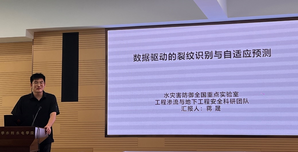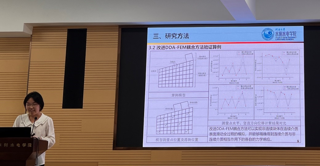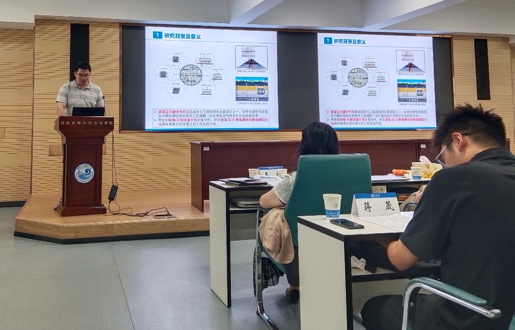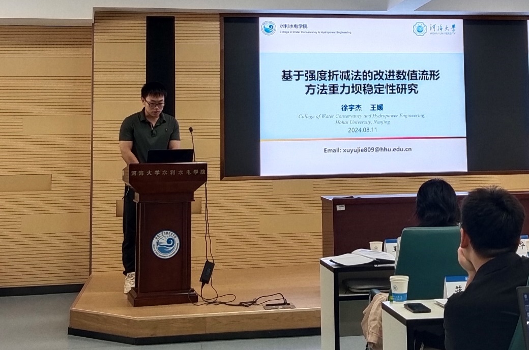 污漫 徐宇杰博士生汇报的题目是“基于强度折减法的改进数值流形法的重力坝稳定性分析”。首先简要介绍了重力坝稳定性分析中遇到的各种难题。从流体不同作用形式的方面分别解释了对应不同的势能项和其作用形式的不同点。从一个基础的算例到重力坝工程的算例计算,验证了数值流形方法计算的正确性和精确度,揭示了流体的不同作用形式对稳定性分析的影响。