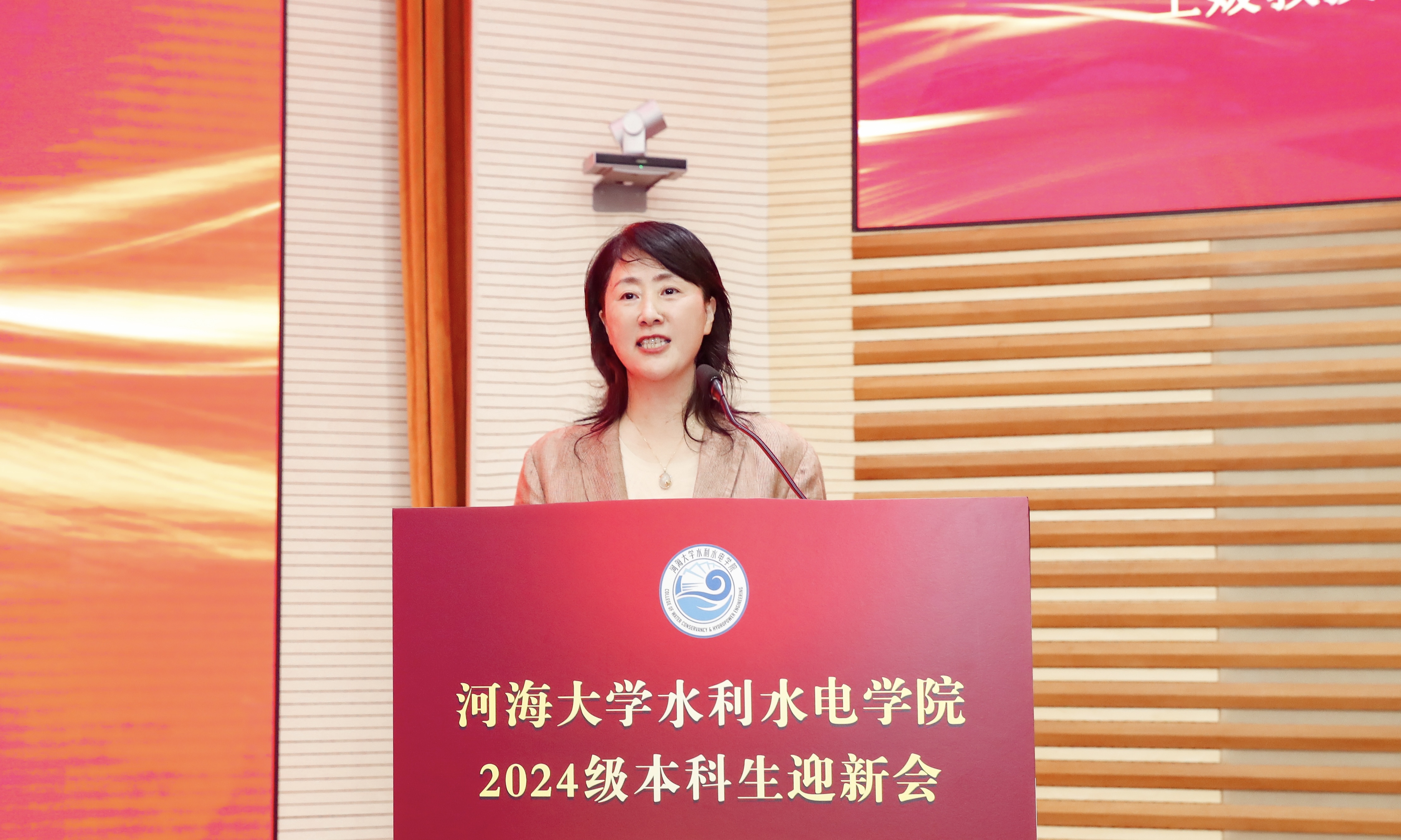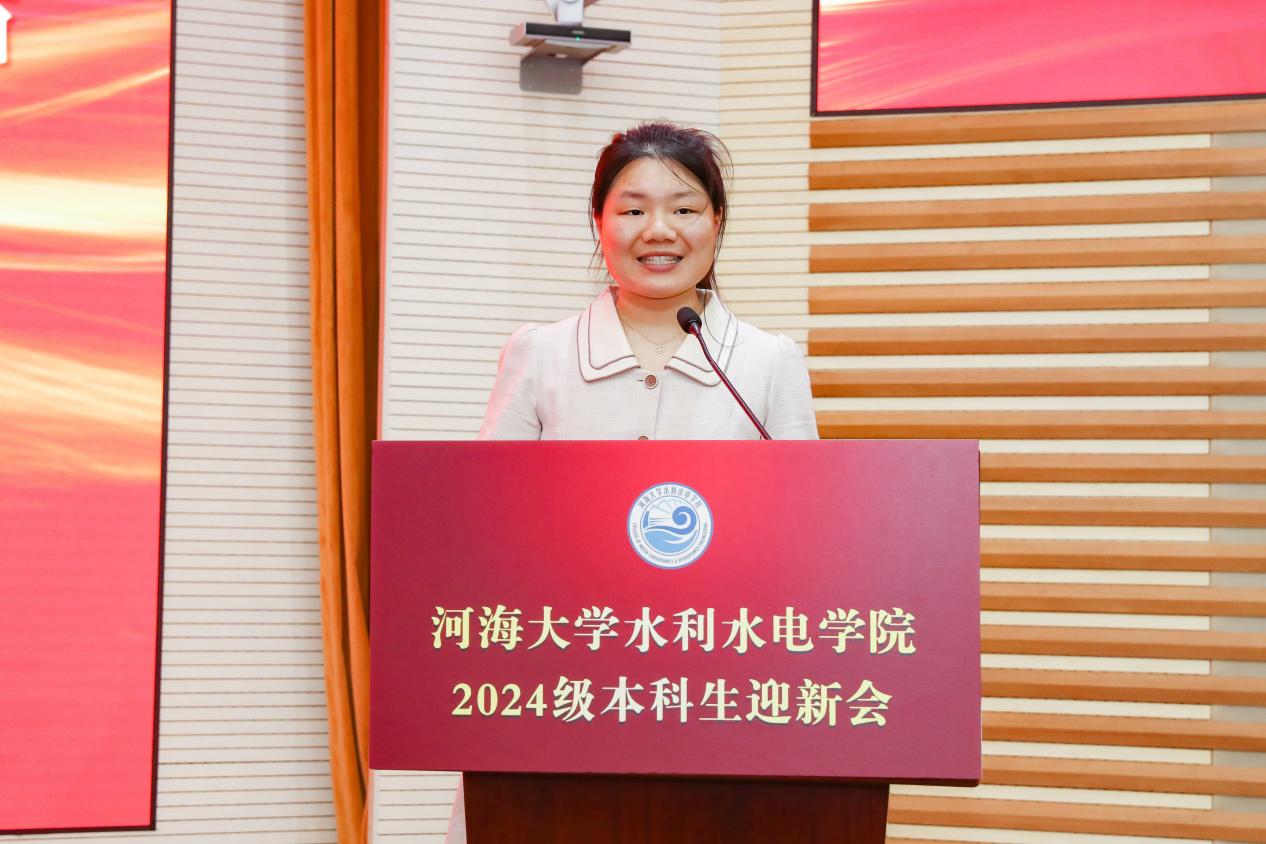 王媛院长对334名新生表示衷心祝贺和热烈欢迎。她从学院办学历史、人才培养、专业特色、系所设置和师资力量等方面介绍了学院雄厚的办学实力、丰硕的科研成果和杰出的校友代表。王媛院长对2024级新生们提出三点期许:一是心有大我,怀抱至诚报国的理想信念。二是勤学笃行,坚持求是创新的躬耕态度。三是学以明志,传承卓越精进的弘道追求。她勉励同学们牢记水电人的追求与使命,以"艰苦朴素"为基,以"实事求是"为尺,以"严格要求"为镜,以"勇于探索"为帆,书写属于这一代水电人的辉煌篇章!