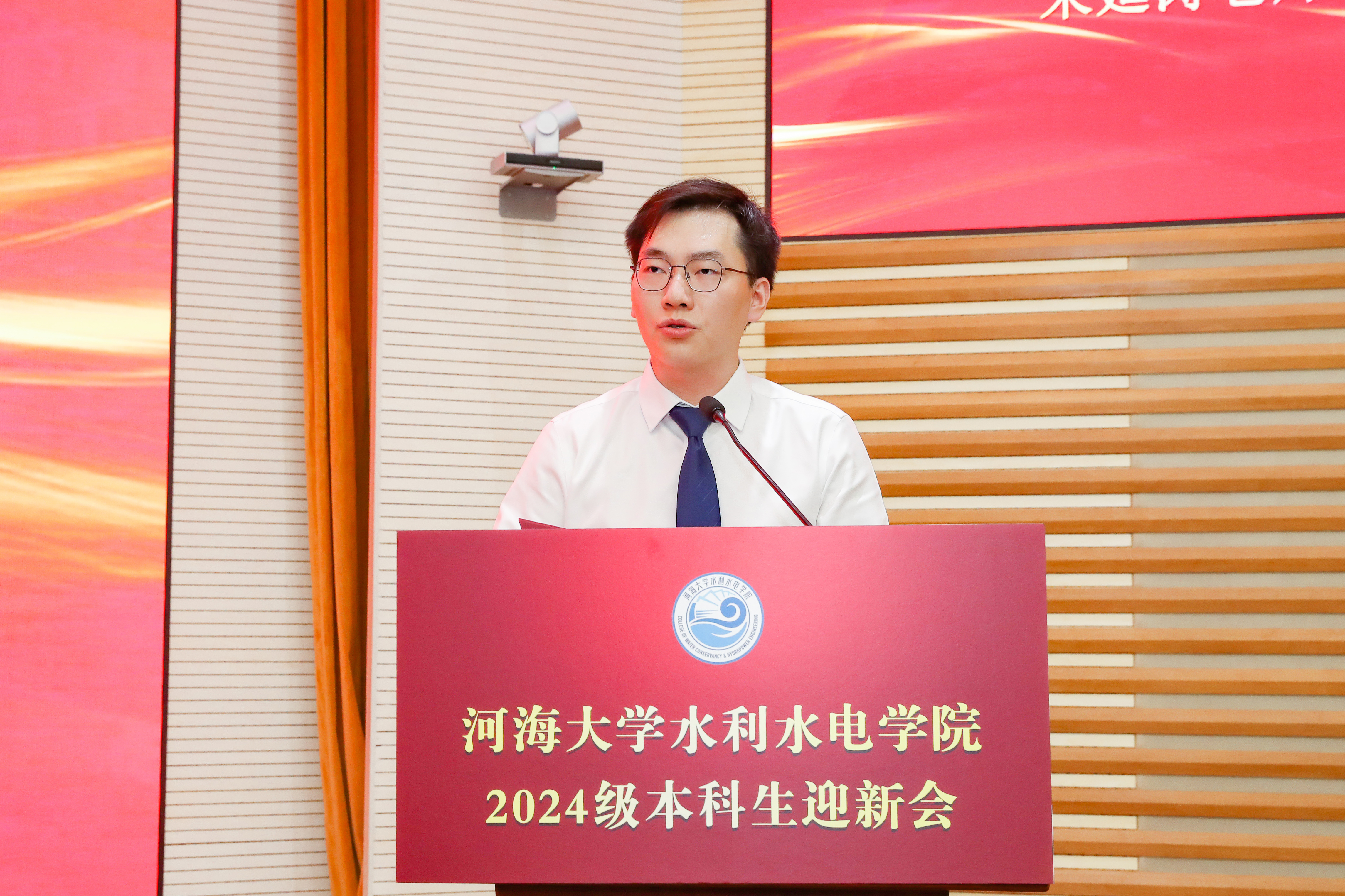 新生代表2024级水工专业毛思源同学代表全体新生同学向老师致以教师节诚挚的祝福,并讲述自己在高考备考、填报志愿、招生录取、初入校园等不同阶段的感受变化,他表示把握当下、规划未来要做到保持热情、拓展视野、不忘初心,以无悔的青春与同学们并肩前行,发扬水电精神。
