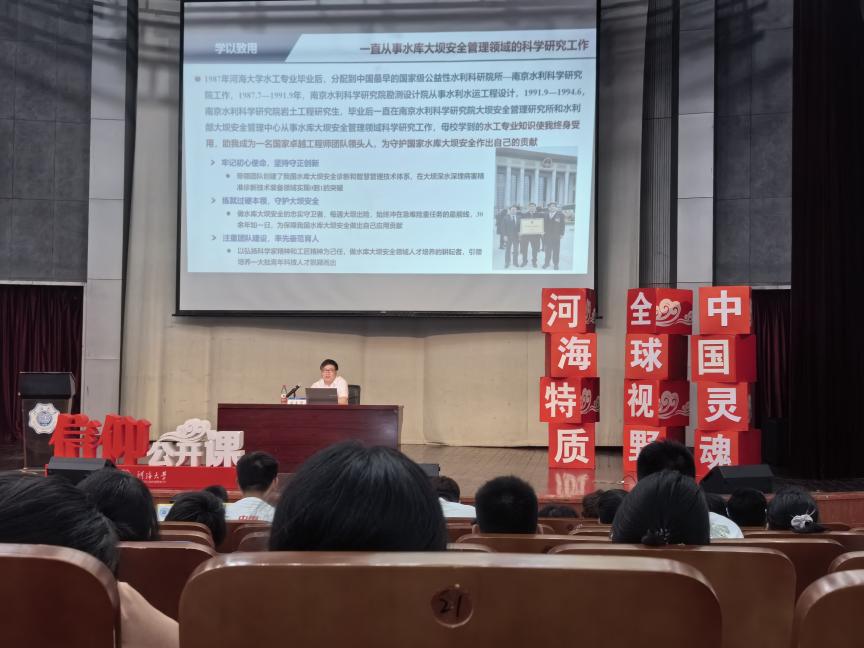盛金保校友现任水利部大坝安全管理中心总工程师、南京水利科学研究院大坝安全与管理研究所所长,兼任污漫 教授,领衔团队荣获首届“国家卓越工程师团队”等荣誉称号。分享会上,盛教授以“学以致用,为水库大坝安全保驾护航”为主题,向新生们详细讲述了水库大坝在国家水安全和公共安全中的重要性,强调了保障大坝安全是水利学子的责任和使命。