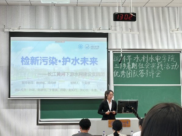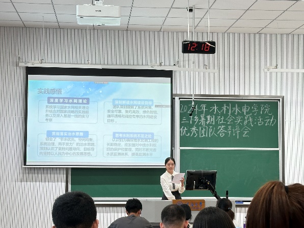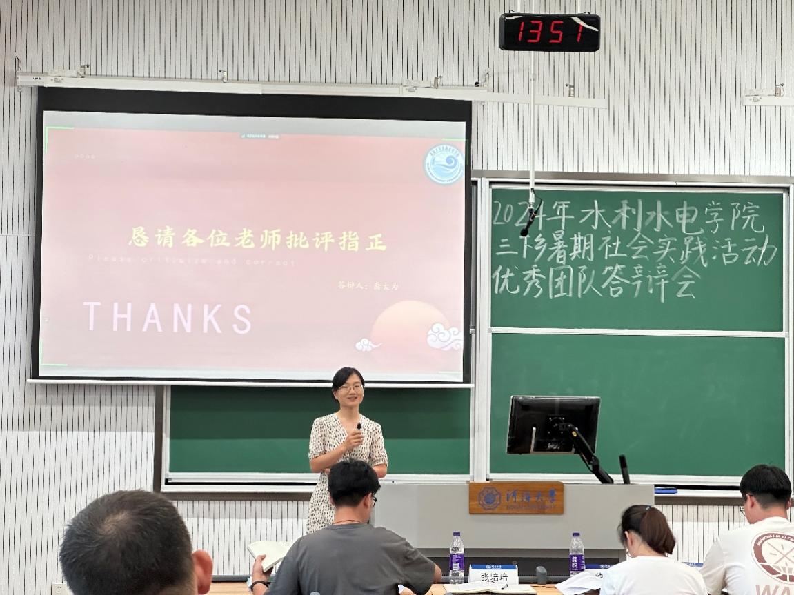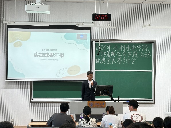 答辩会上,17支评优团队的代表依次上台,就暑期社会实践项目进行了精彩的展示,通过PPT、视频等多种形式生动详实地汇报了在暑期社会实践中的工作内容、实施过程、所取得的成果以及遇到的挑战和解决方案。这些实践项目涵盖了发展成就观察、乡村振兴、红色文化传承等多个方面,从调研水网建设现状到探寻新能源的绿色转型之路,从走进千乡万村进行科普宣传到保护红色水利遗产,充分展现了河海学子将专业知识与社会实践相结合的能力。