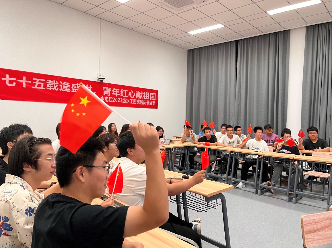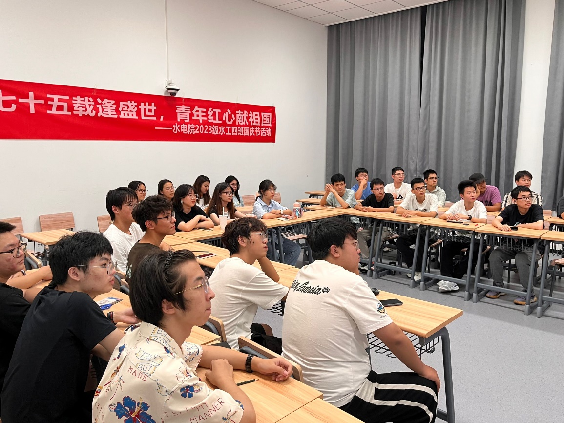 在金秋送爽、举国同庆的美好时节,我们迎来了中华人民共和国成立75周年的辉煌时刻。水电院2023级本科生开展“七十五载逢盛世,青年红心献祖国”庆国庆主题活动。活动由水工四班团支书赵馨主持。